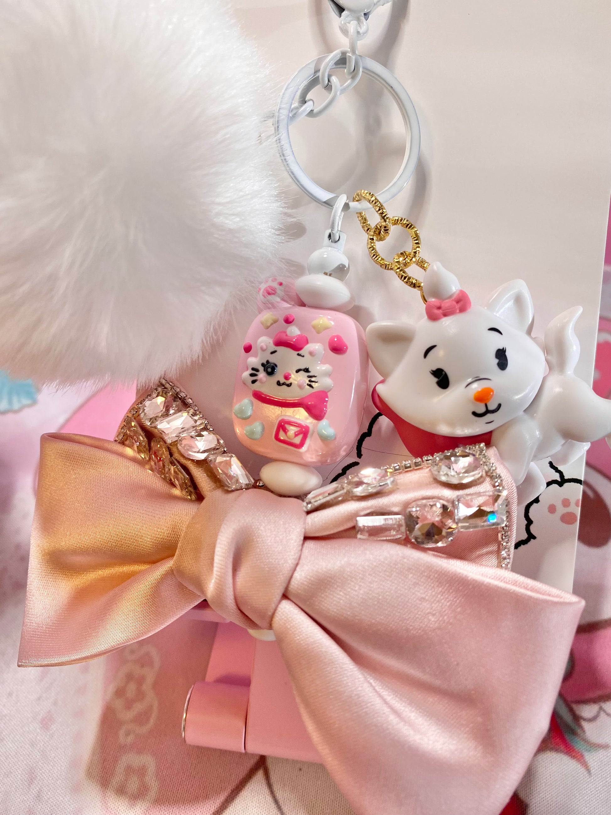 This keychain features a cute Kitty charm, hand painted phone bead, large bow and fluffy Pom-pom