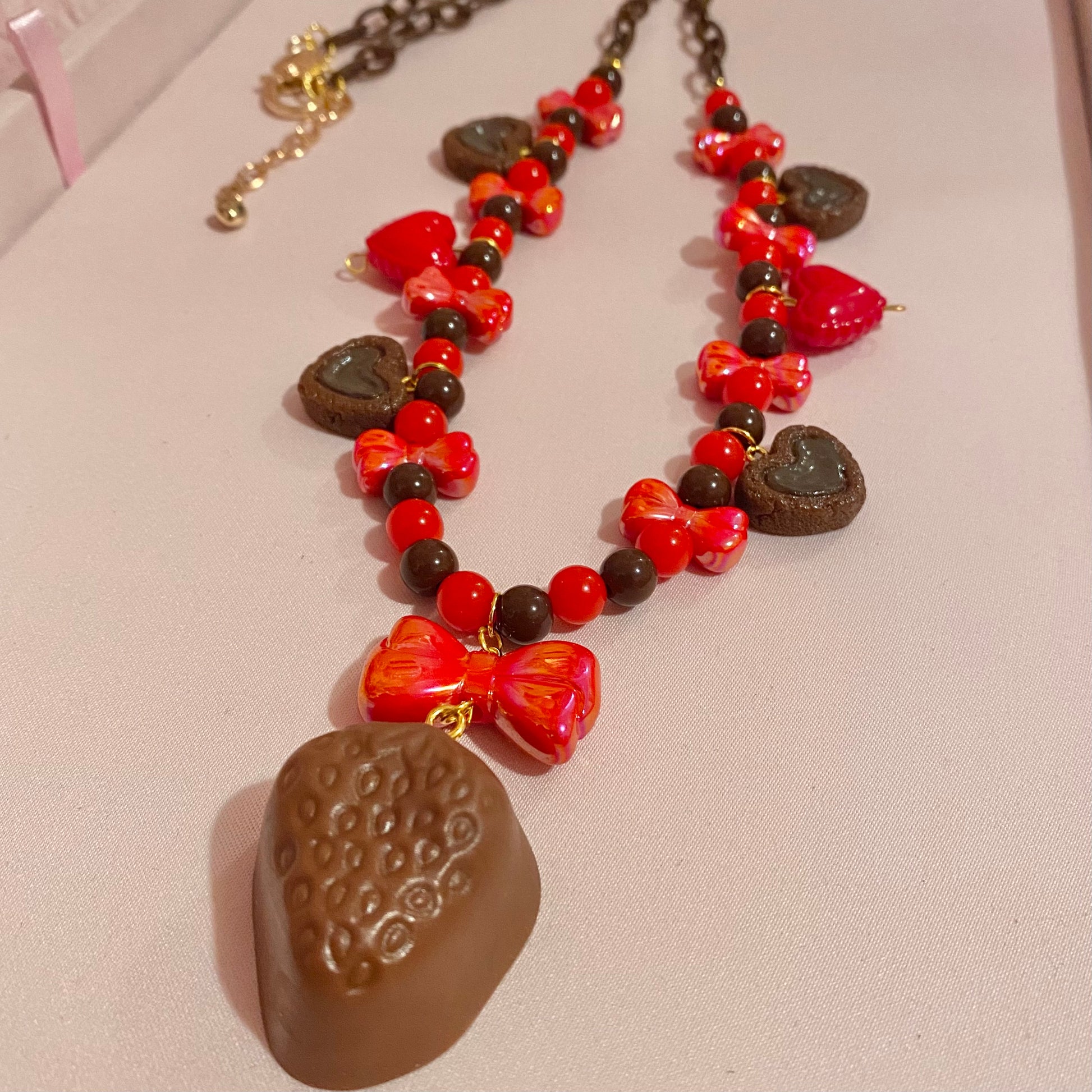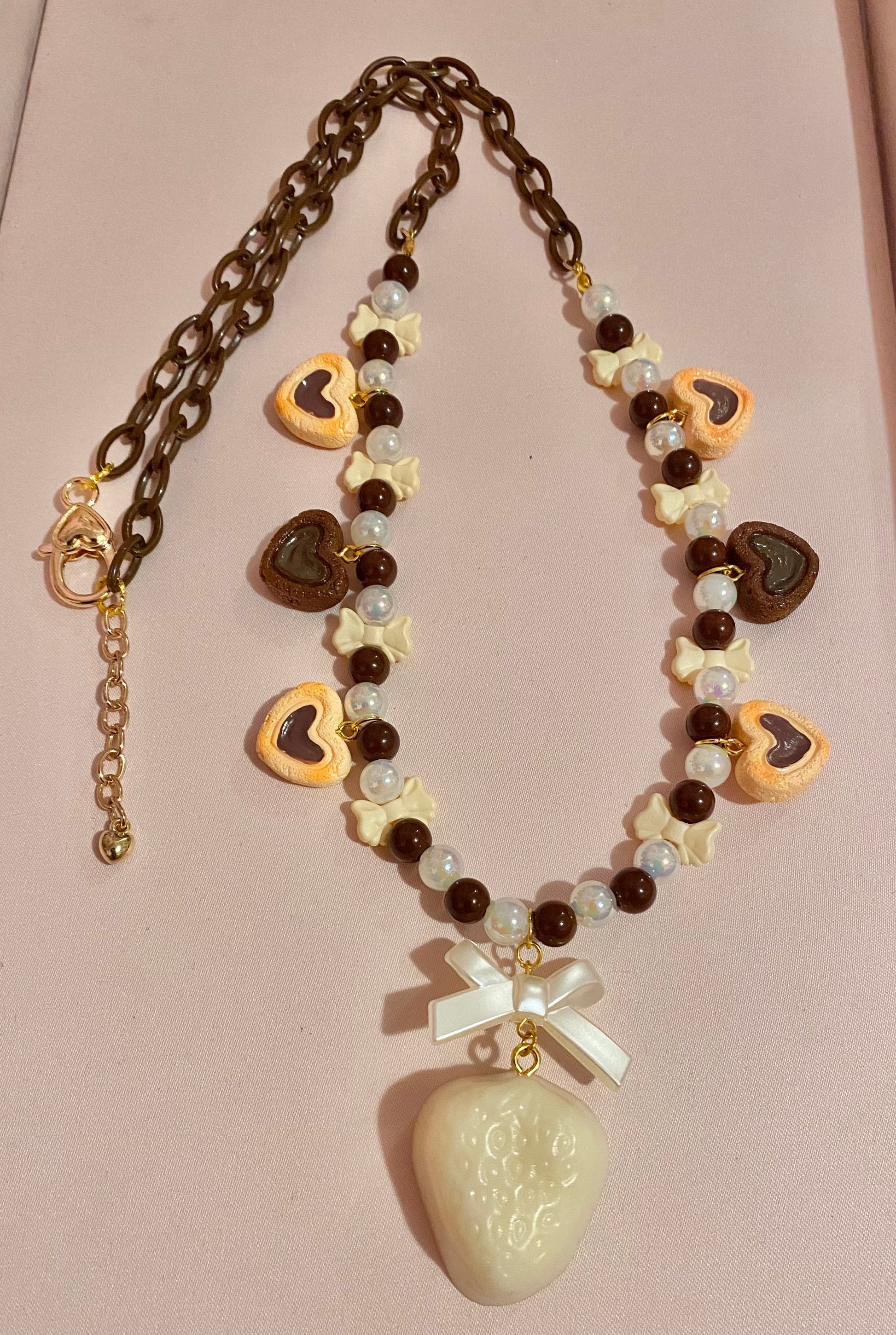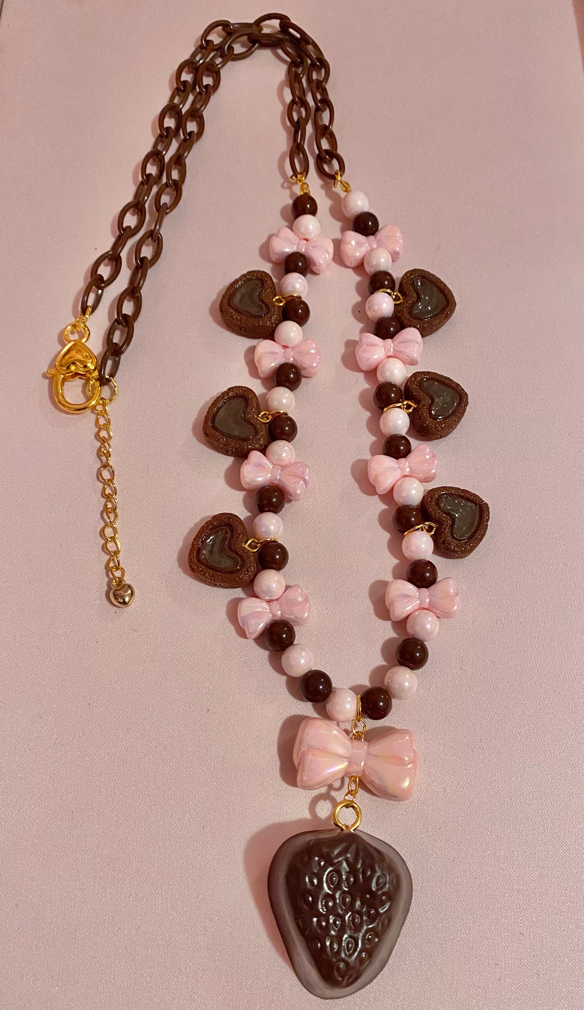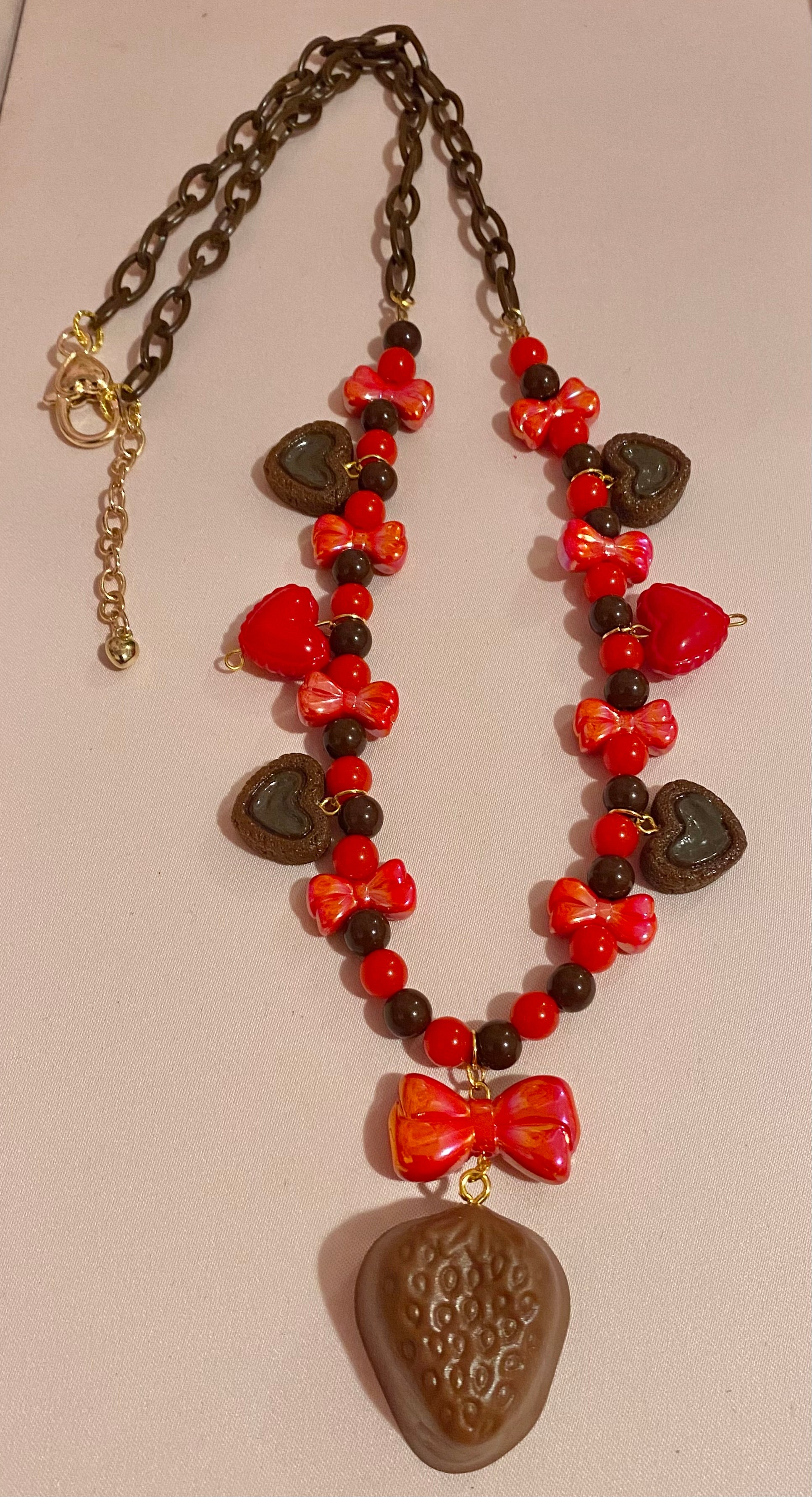 Necklace features a large Strawberry Chocolate centerpiece, lovely irrdesent bow accents and cute chocolate heart cookie 🍪 charms and set in a brown plastic chain for easy lightweight wear