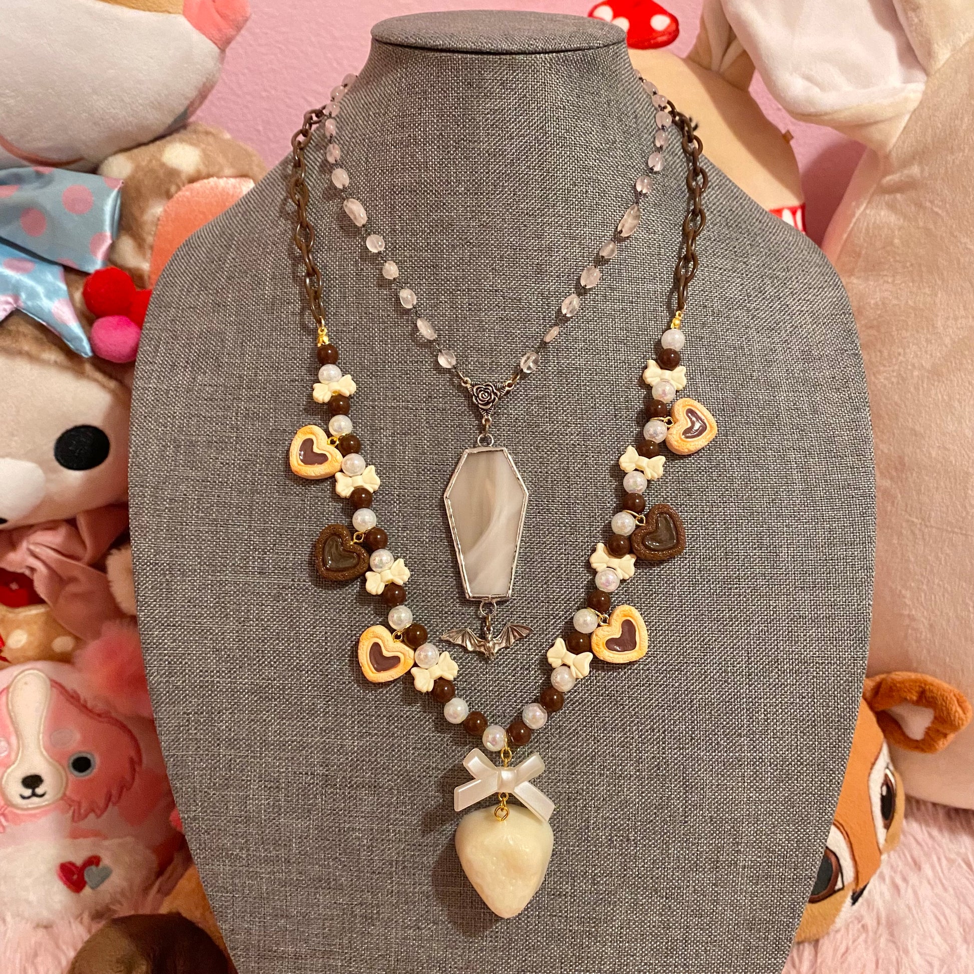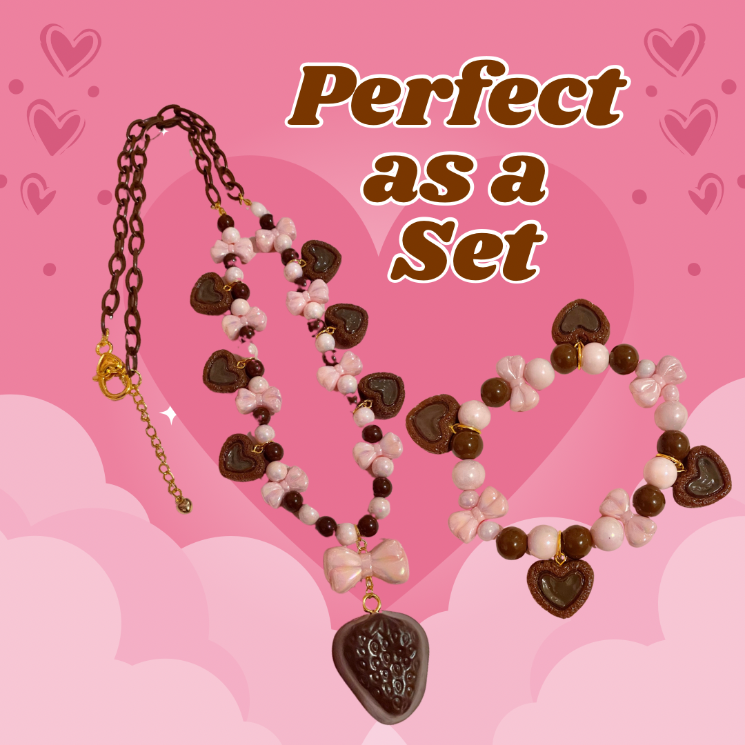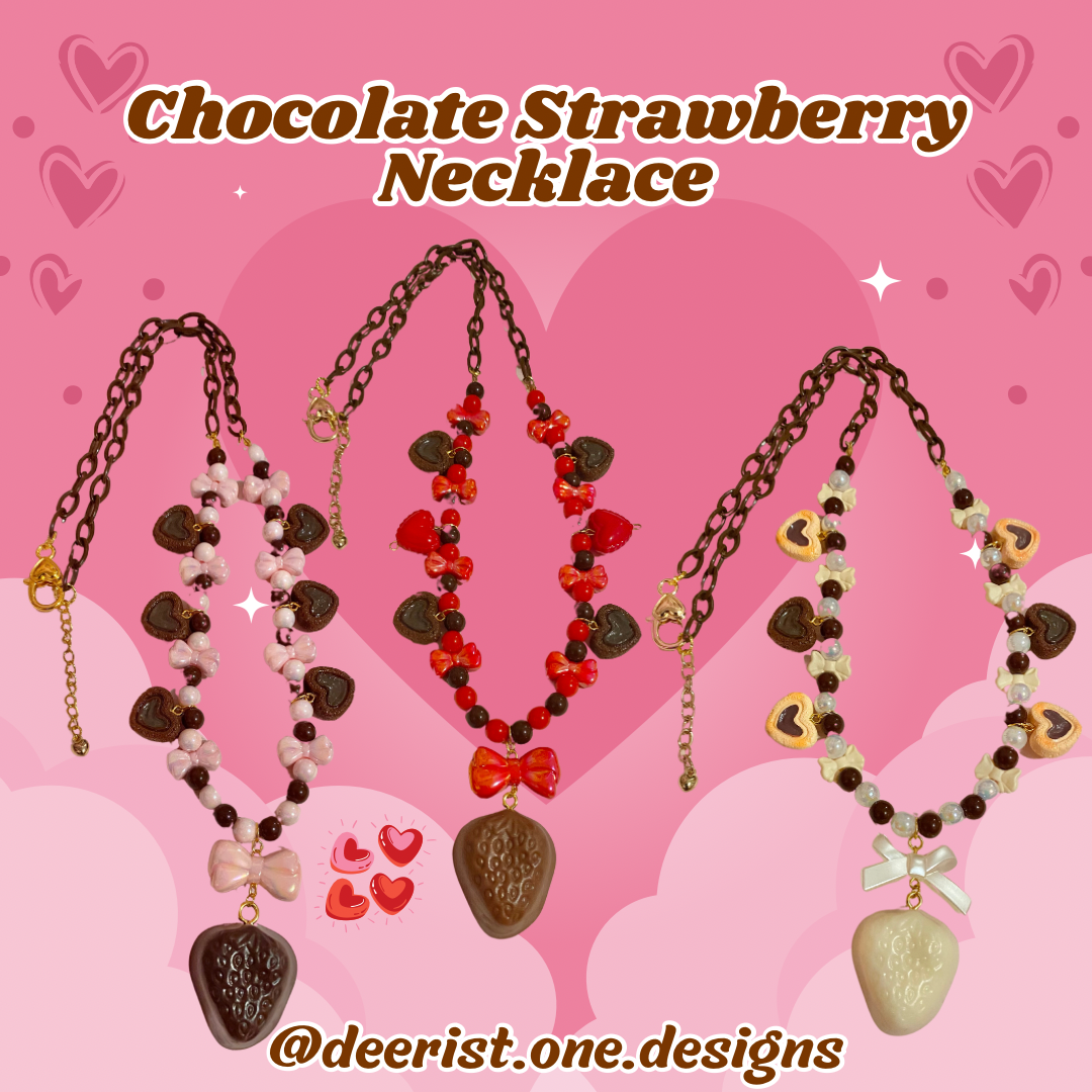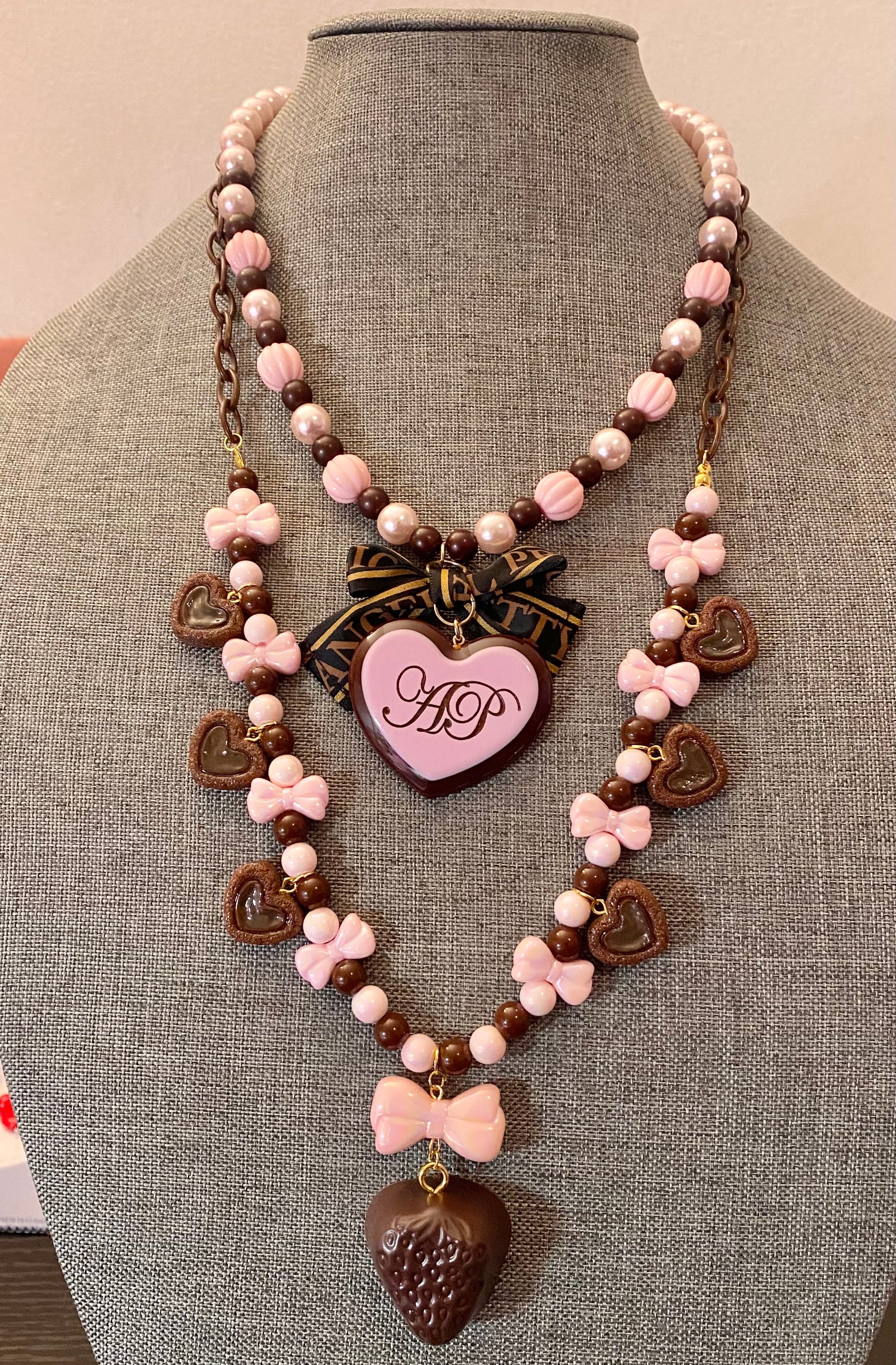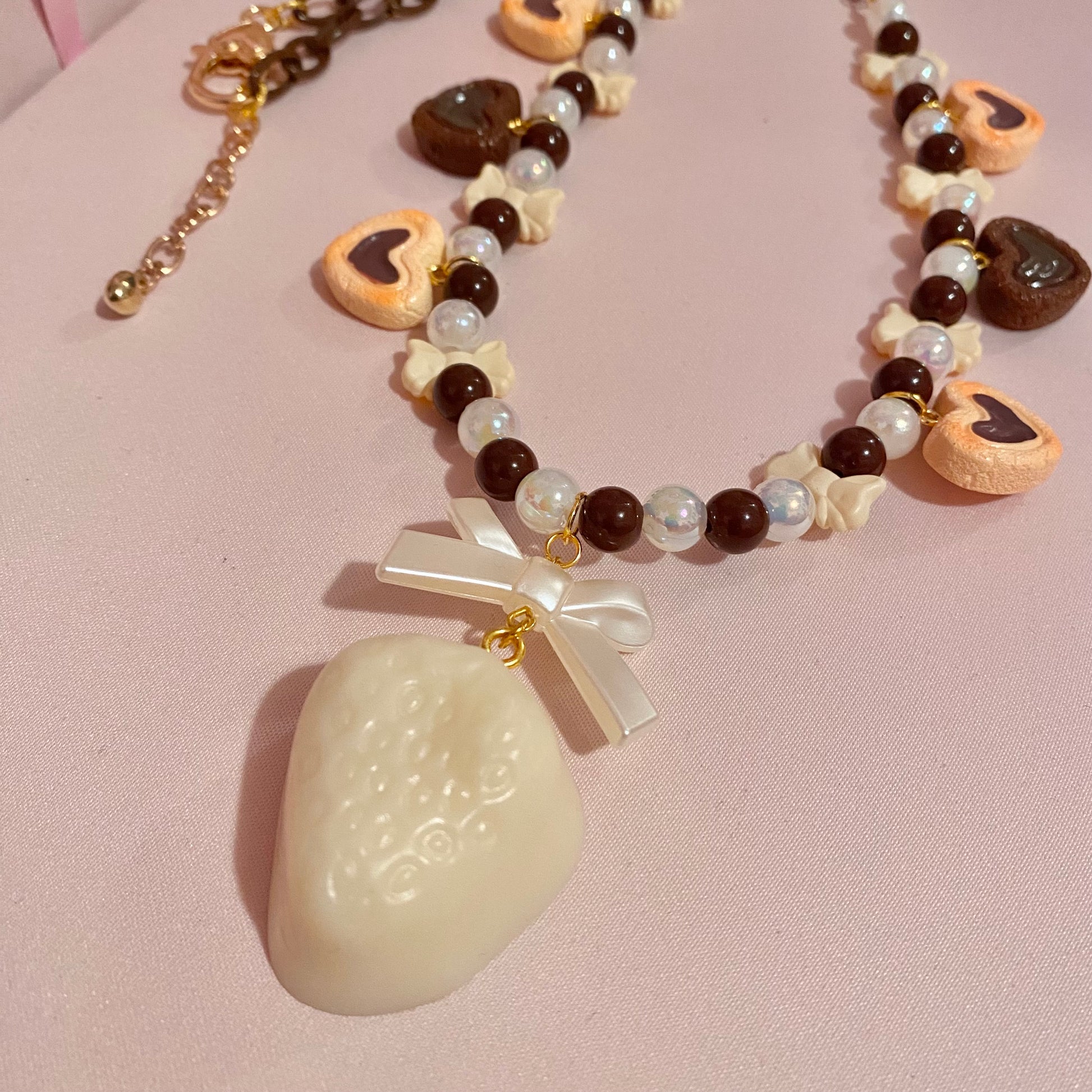 Necklace features a large Strawberry Chocolate centerpiece, lovely irrdesent bow accents and cute chocolate heart cookie 🍪 charms and set in a brown plastic chain for easy lightweight wear