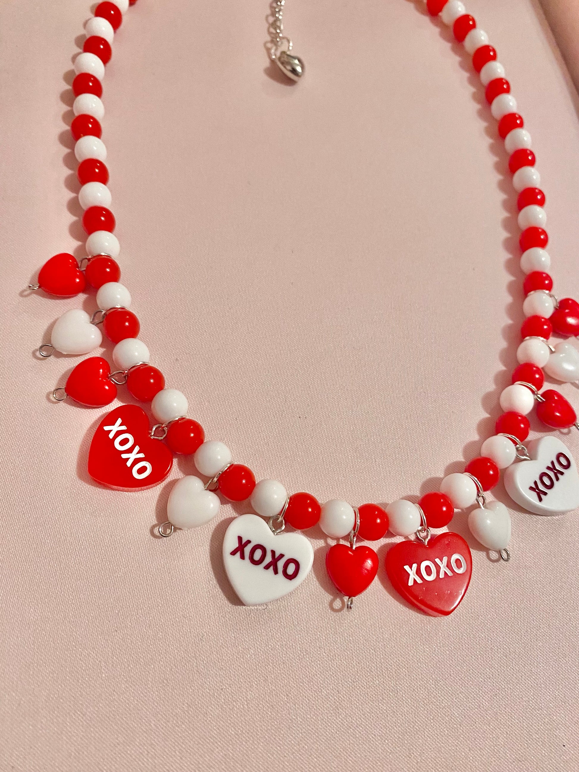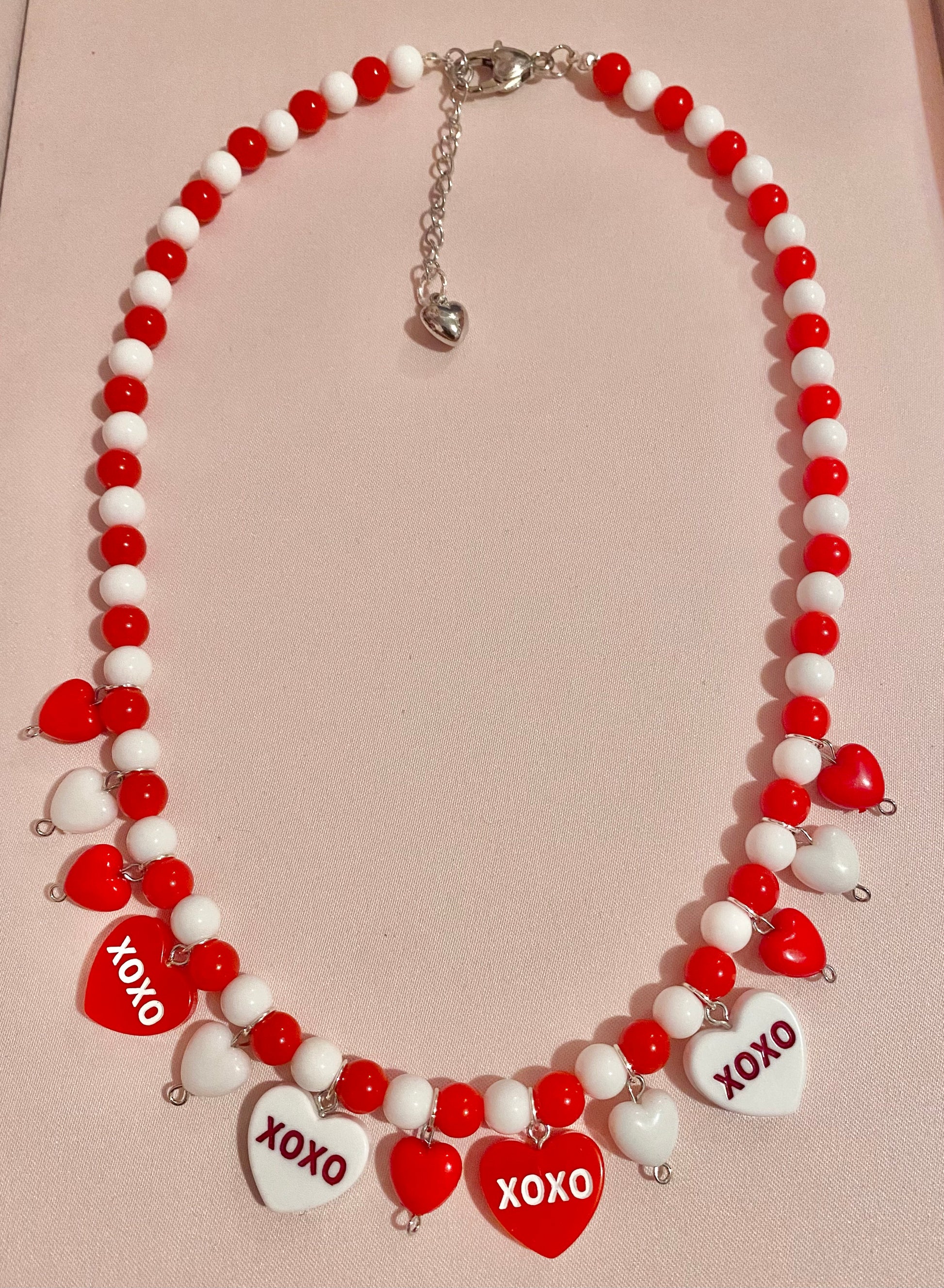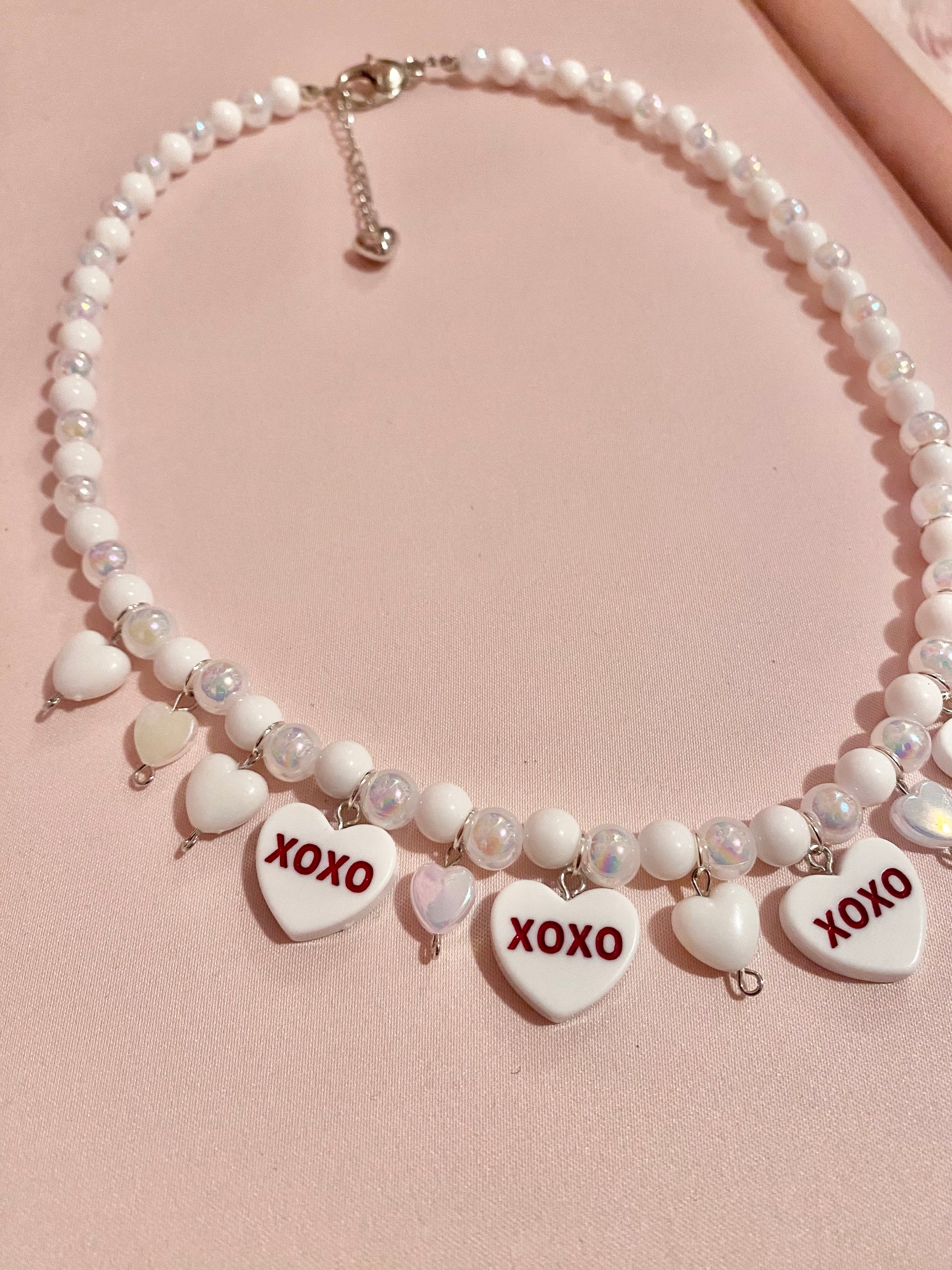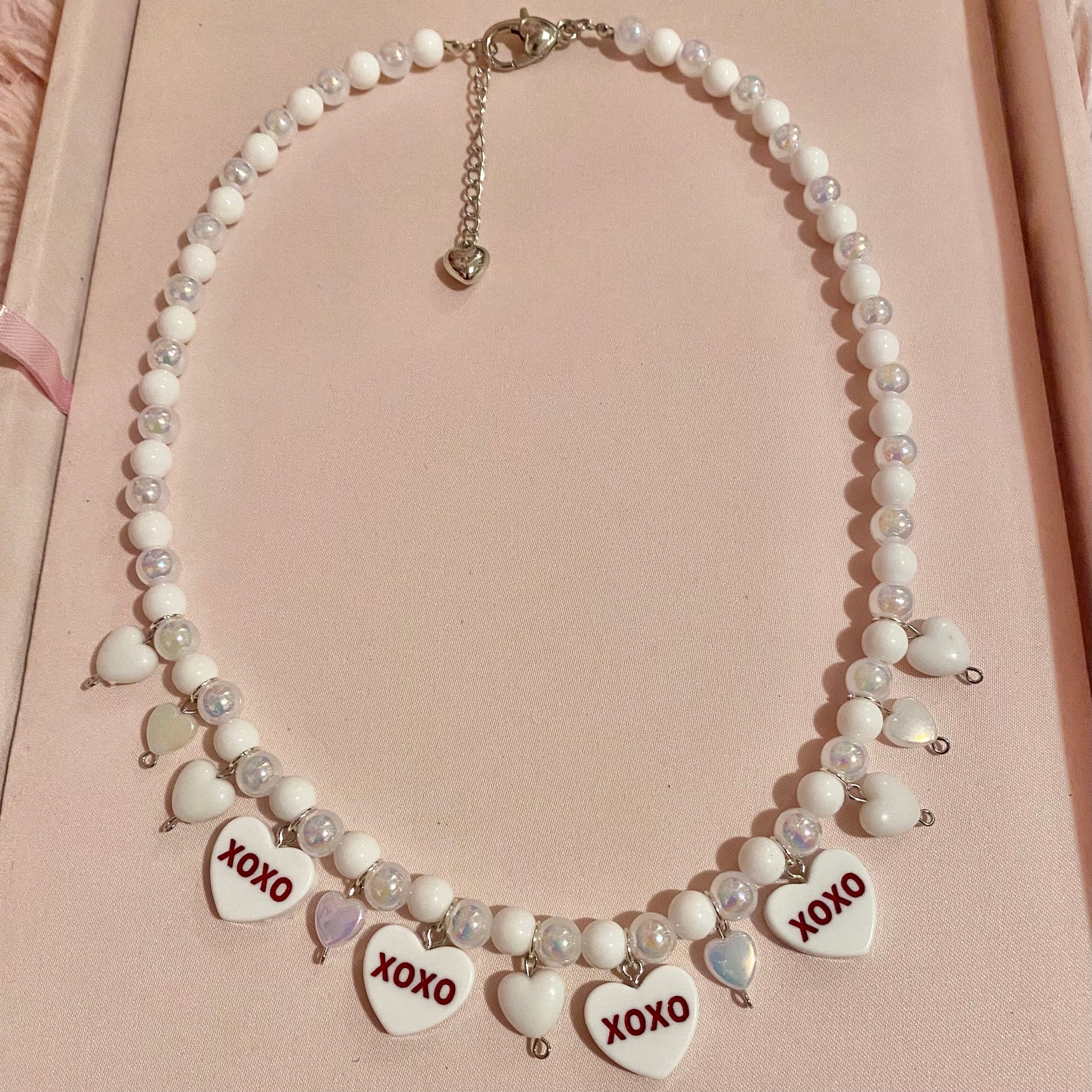 Necklace feature XOXO Conversation Hearts and tiny heart beads