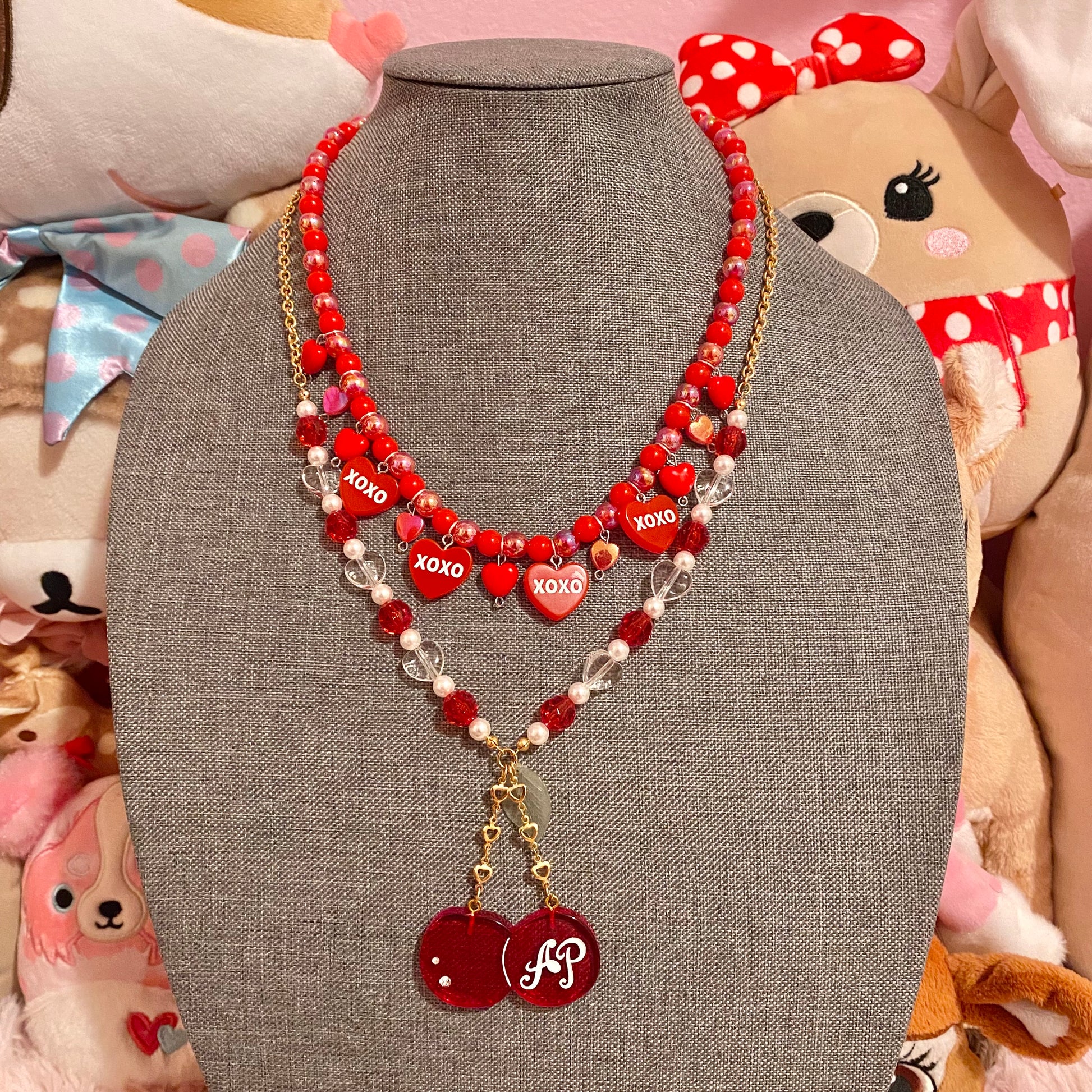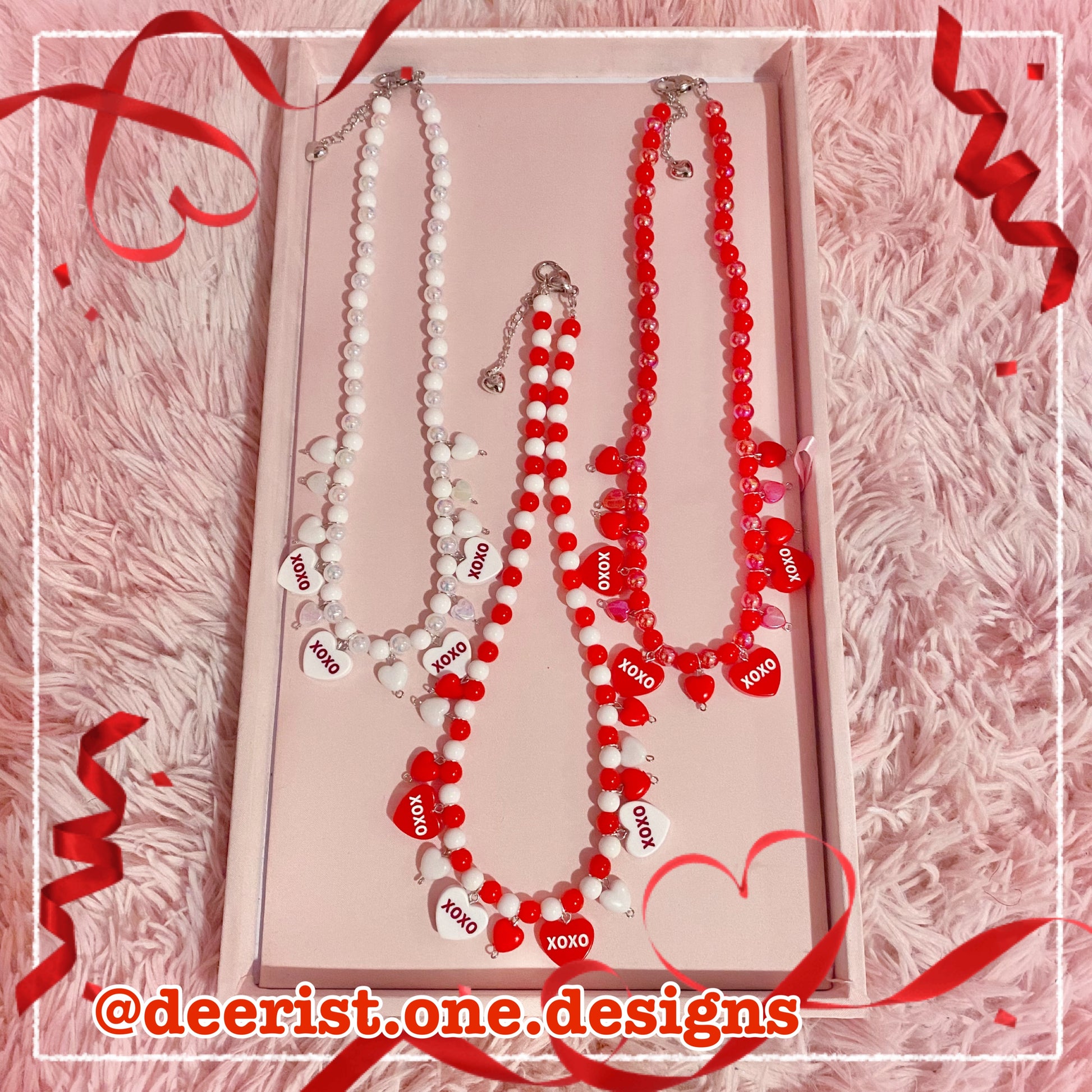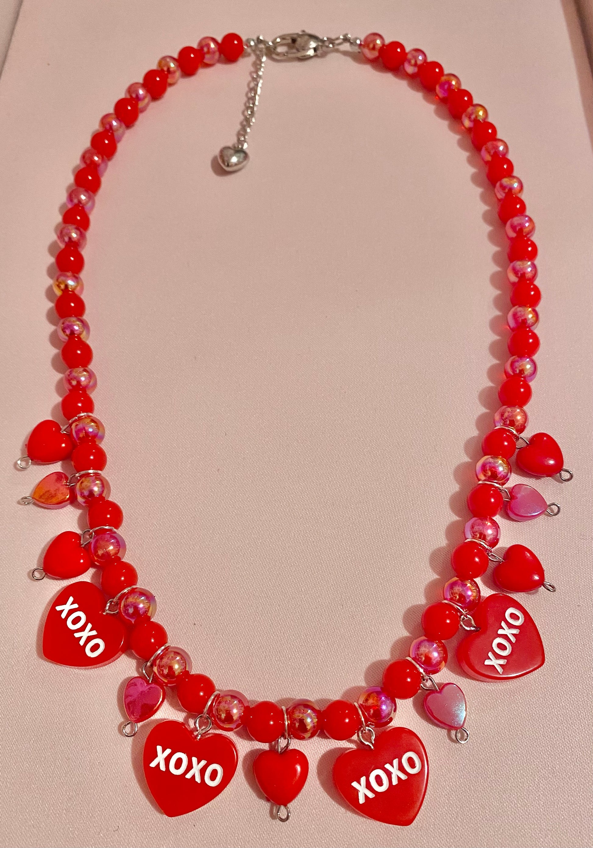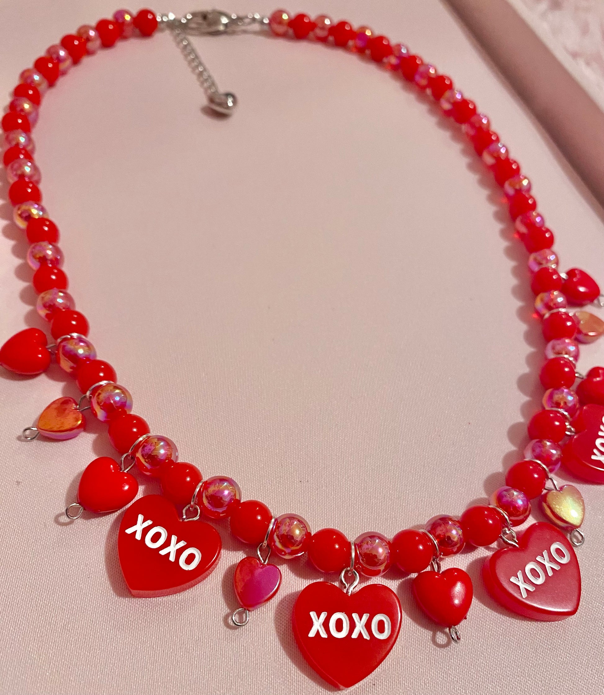 Necklace feature XOXO Conversation Hearts and tiny heart beads