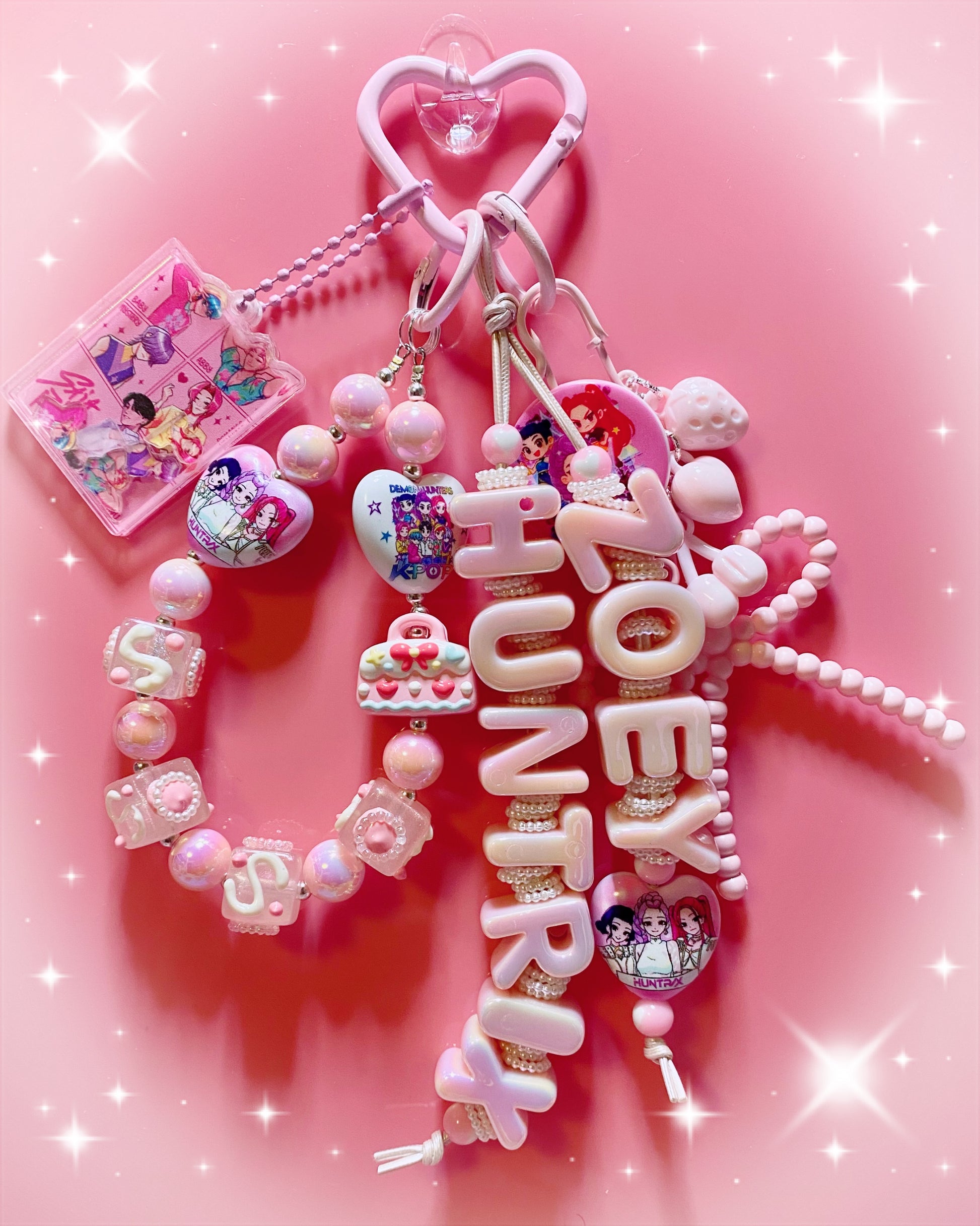 Each Keychain is handmade with a variety of beads, an acrylic shaker, cloth keychain and hand arranged letter keychain