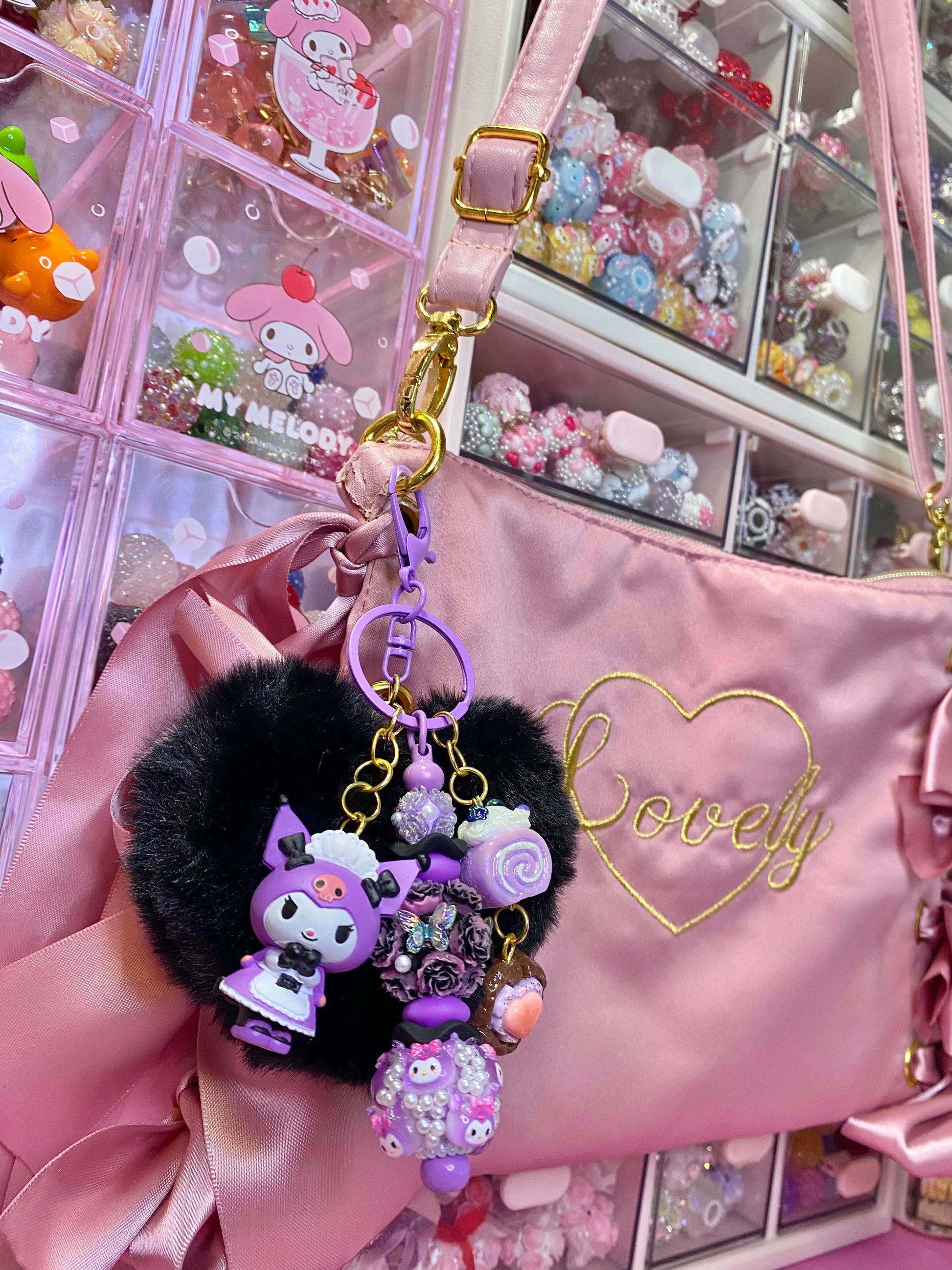 Keychain has various beads on a sturdy bead base, a small doll, an assorted accent bead/charm and a large Pom Pom accent