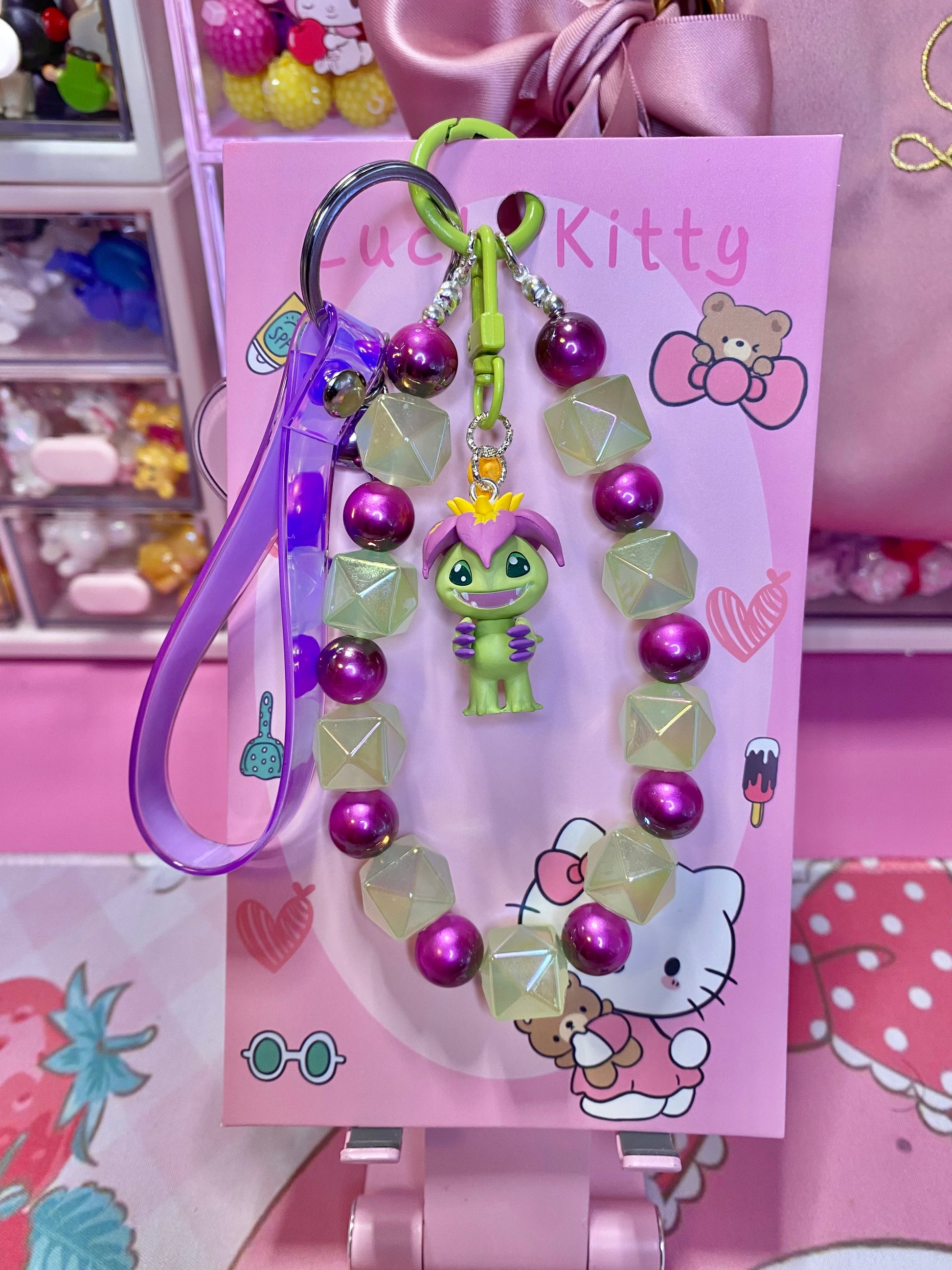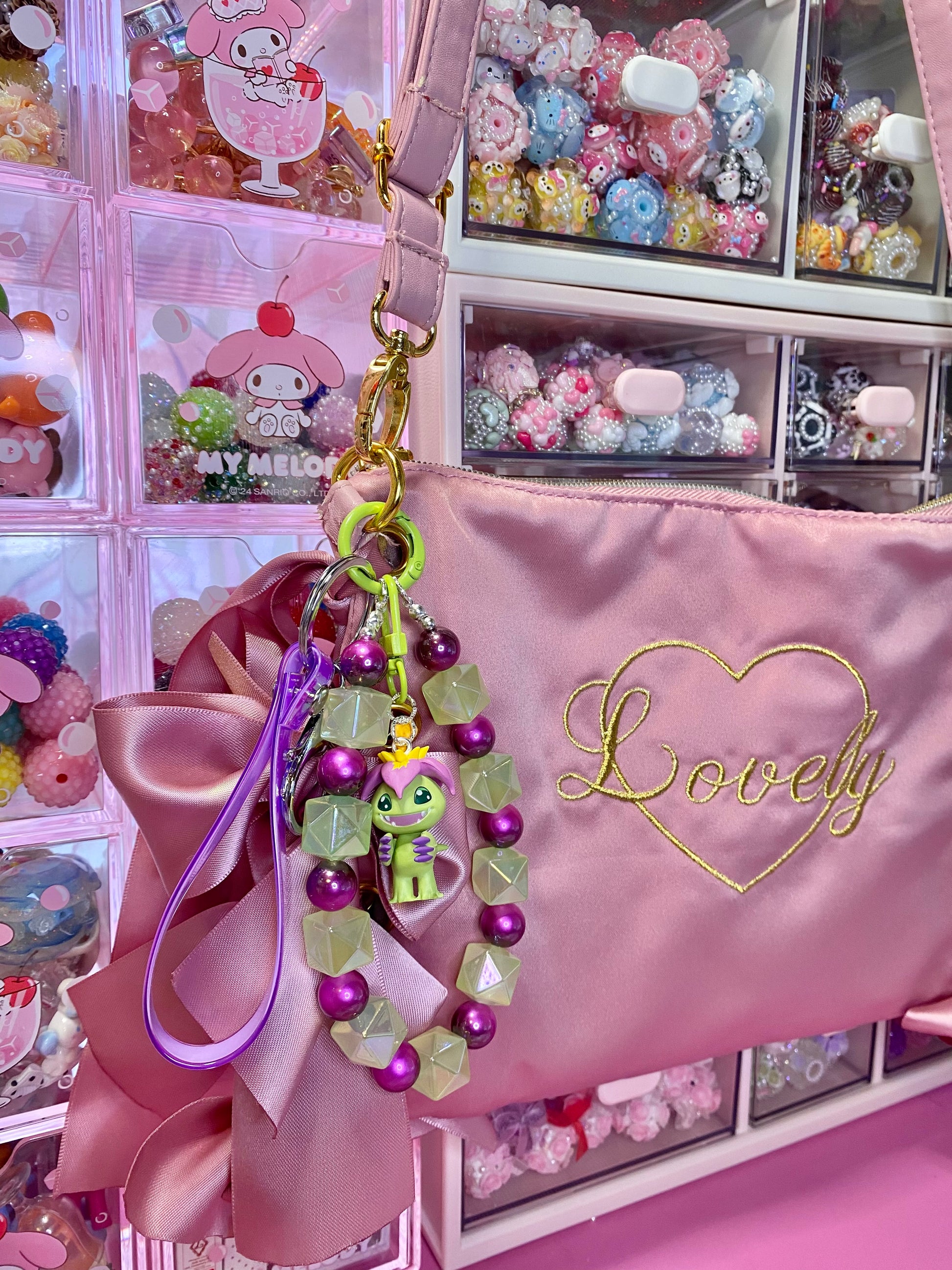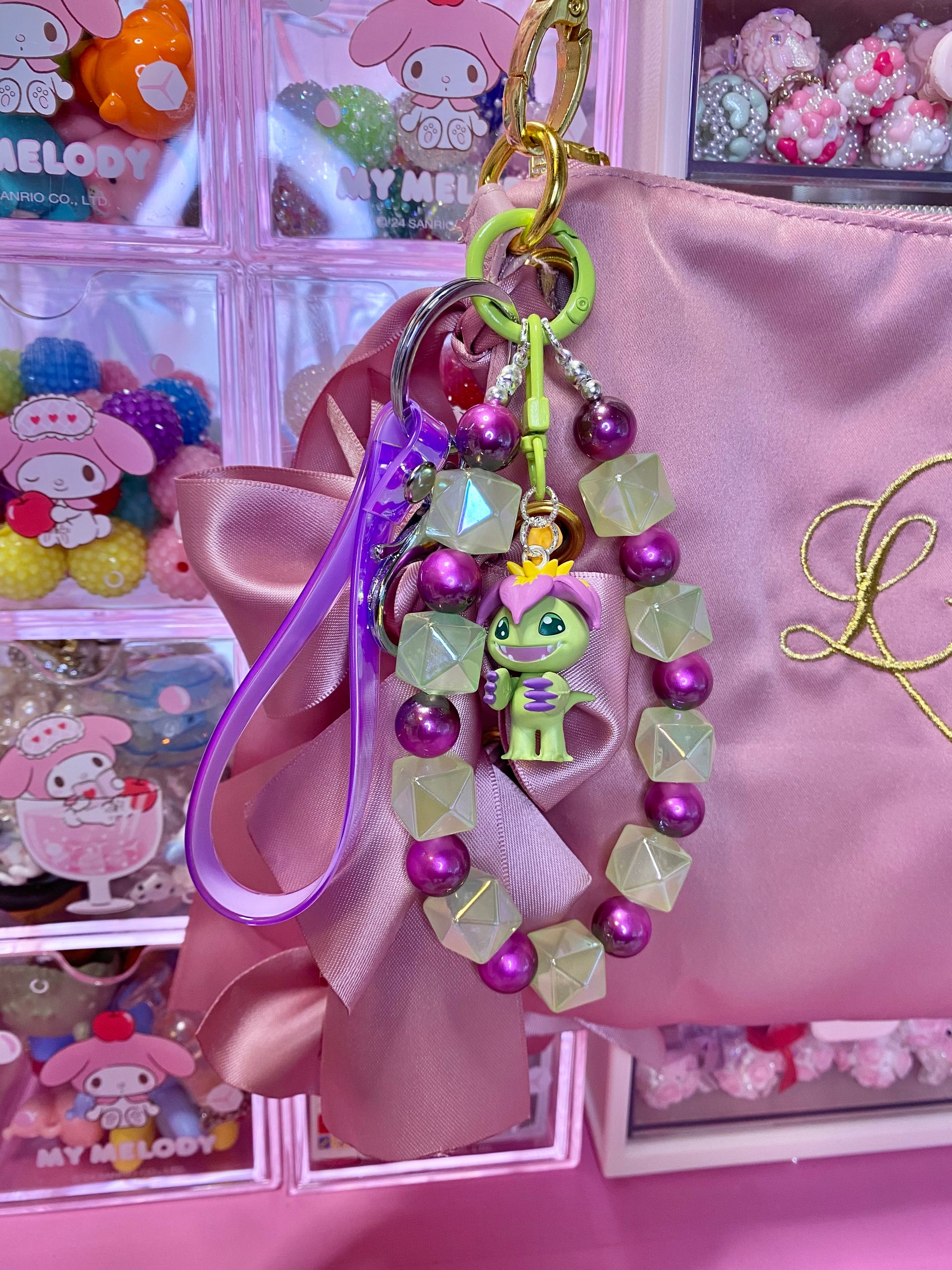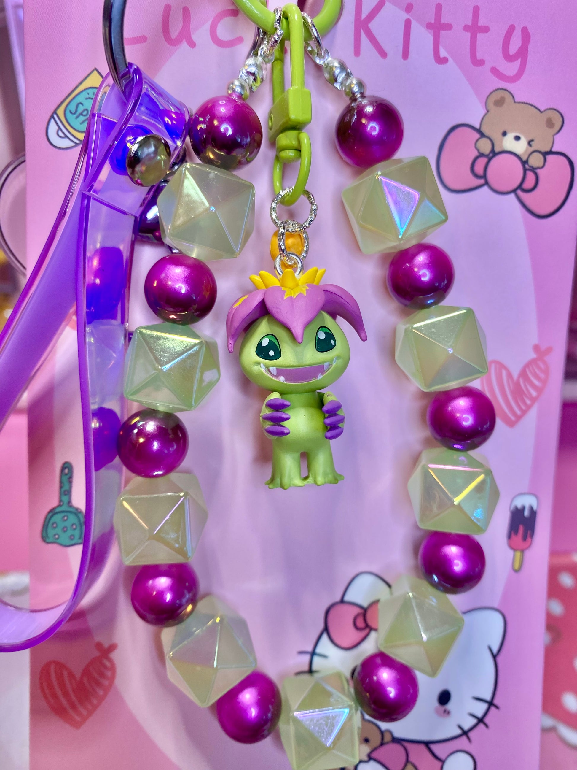 Keychain has various beads on a sturdy bead base, a small doll, an assorted accent bead/charm and a large Pom Pom accent