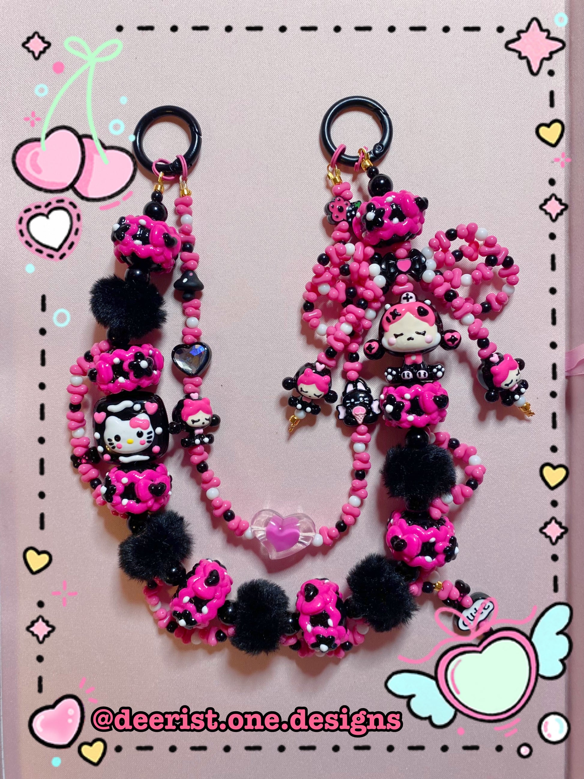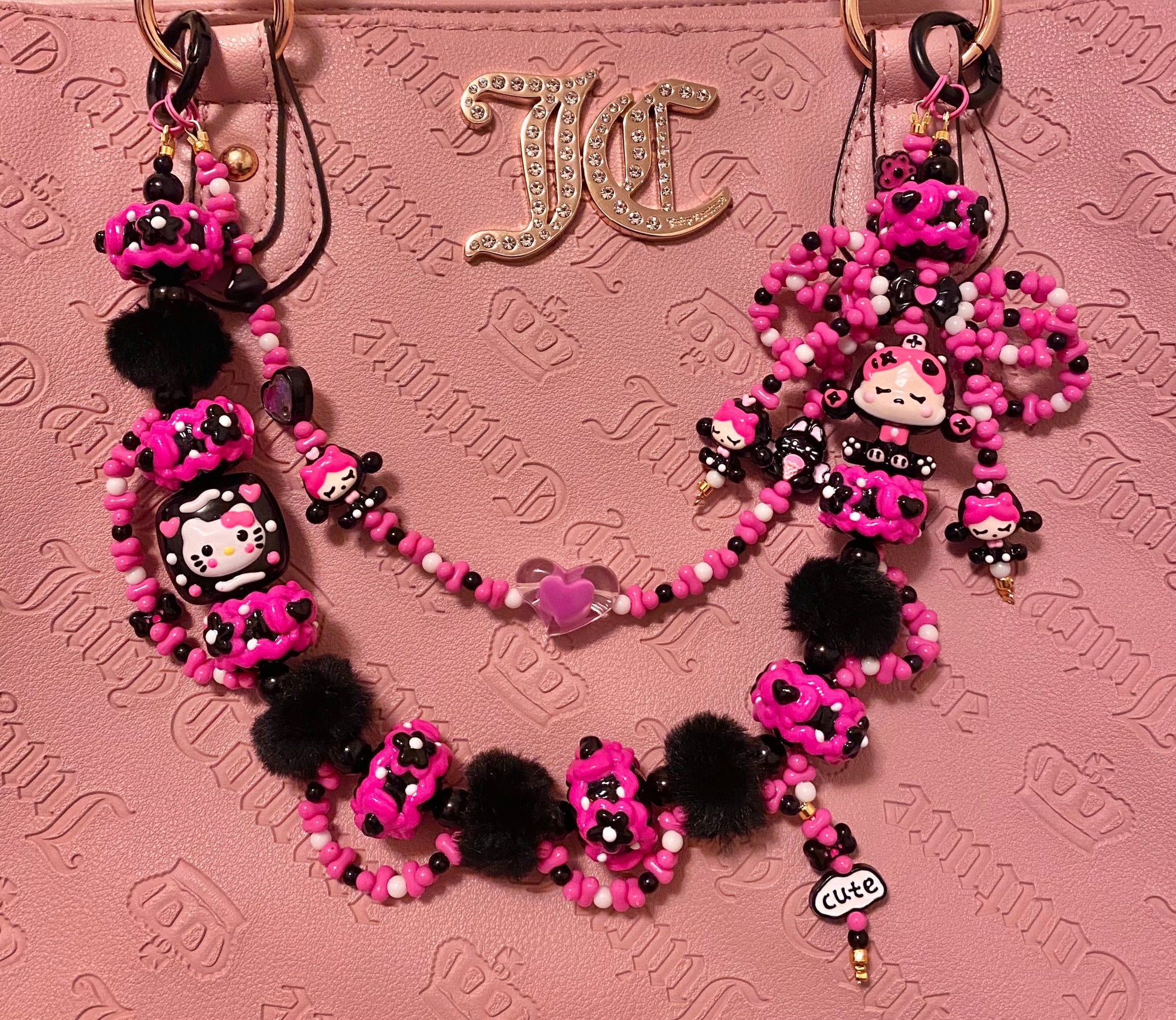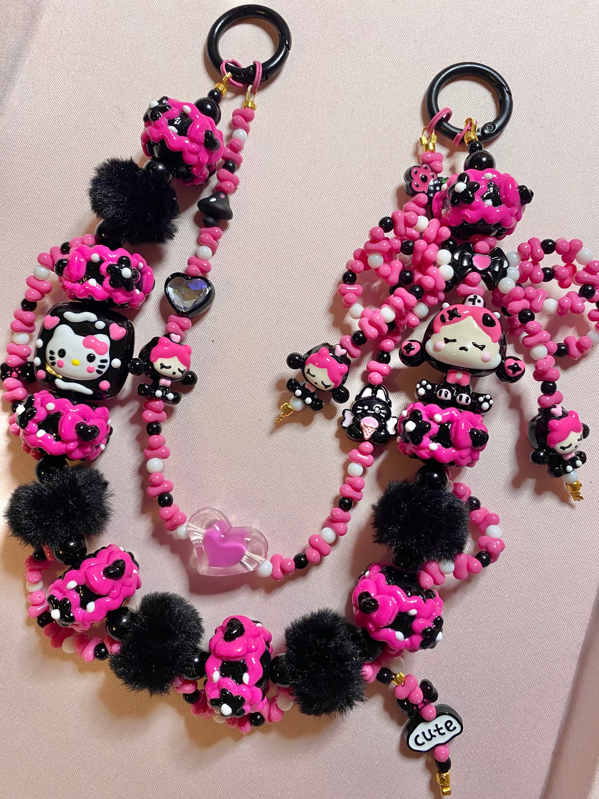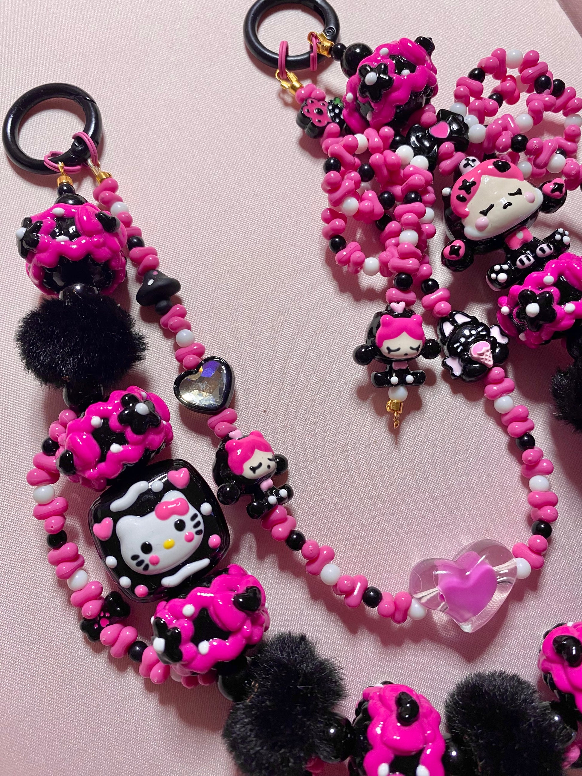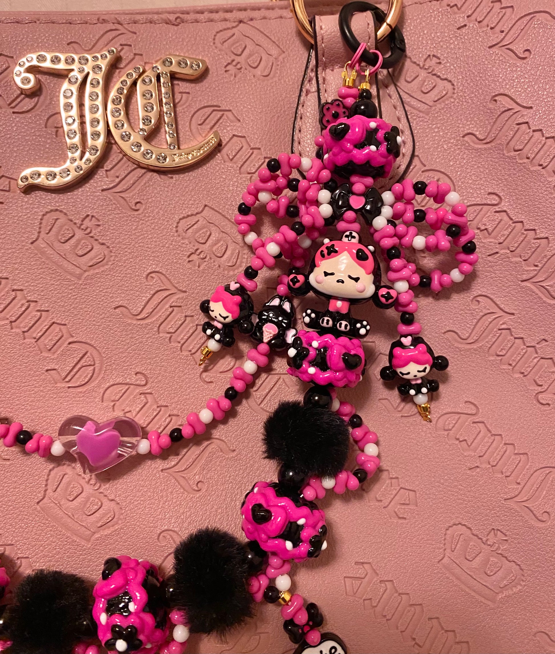 Keychain has a handmade beaded bow, hand painted beads, cute metal beads and fluffy accent beads
