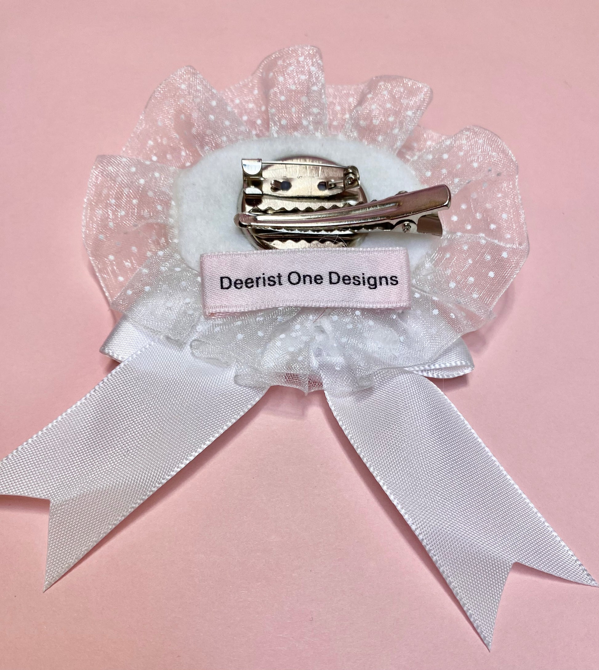Egg 2-way Clip has a pin back and clip setting for 2 ways to wear, with soft white lace and a large white bow