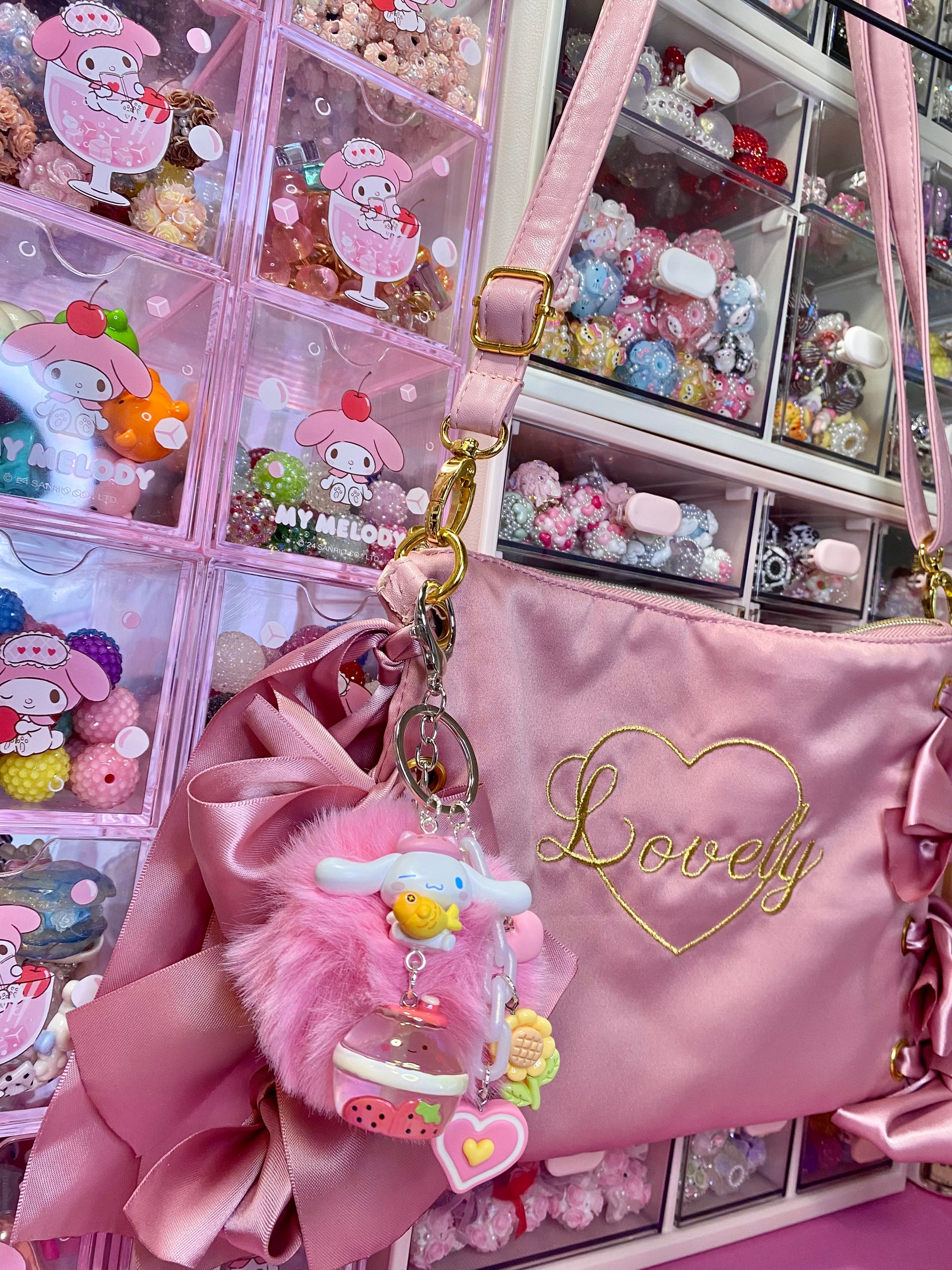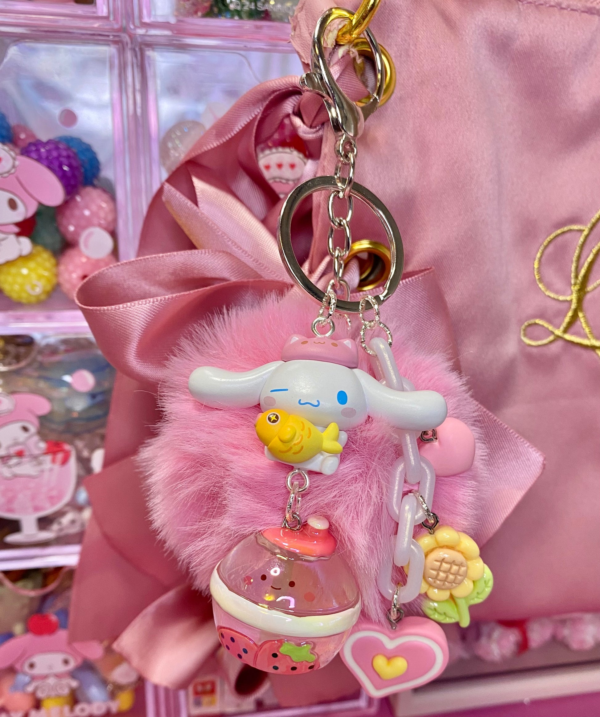 Keychain has various beads on a sturdy bead base, a small doll, an assorted accent bead/charm and a large Pom Pom accent