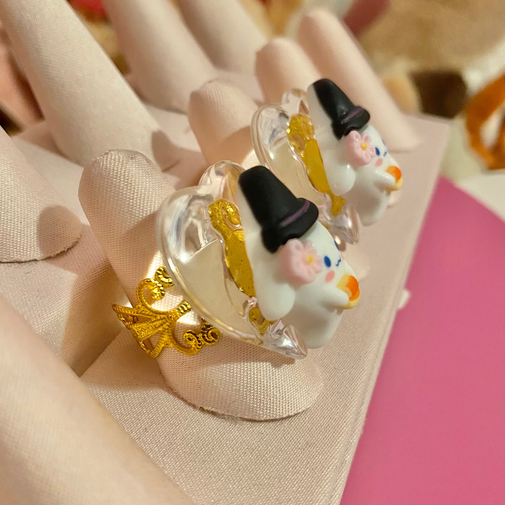 Ghost Puppy Ring is an original design with a cute ghost puppy center on a clear glass heart with an adjustable ring band to fit a variety of sizes.