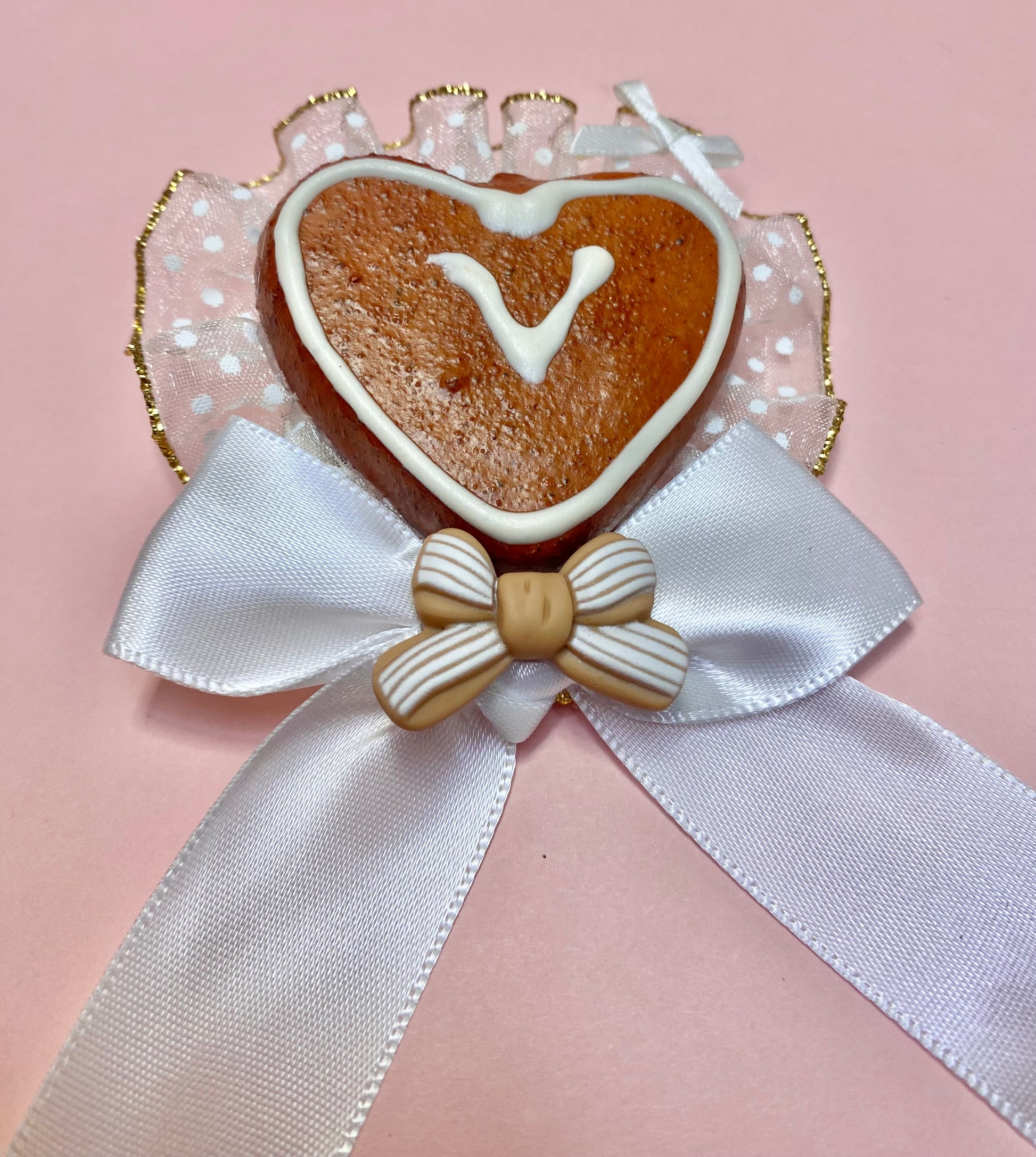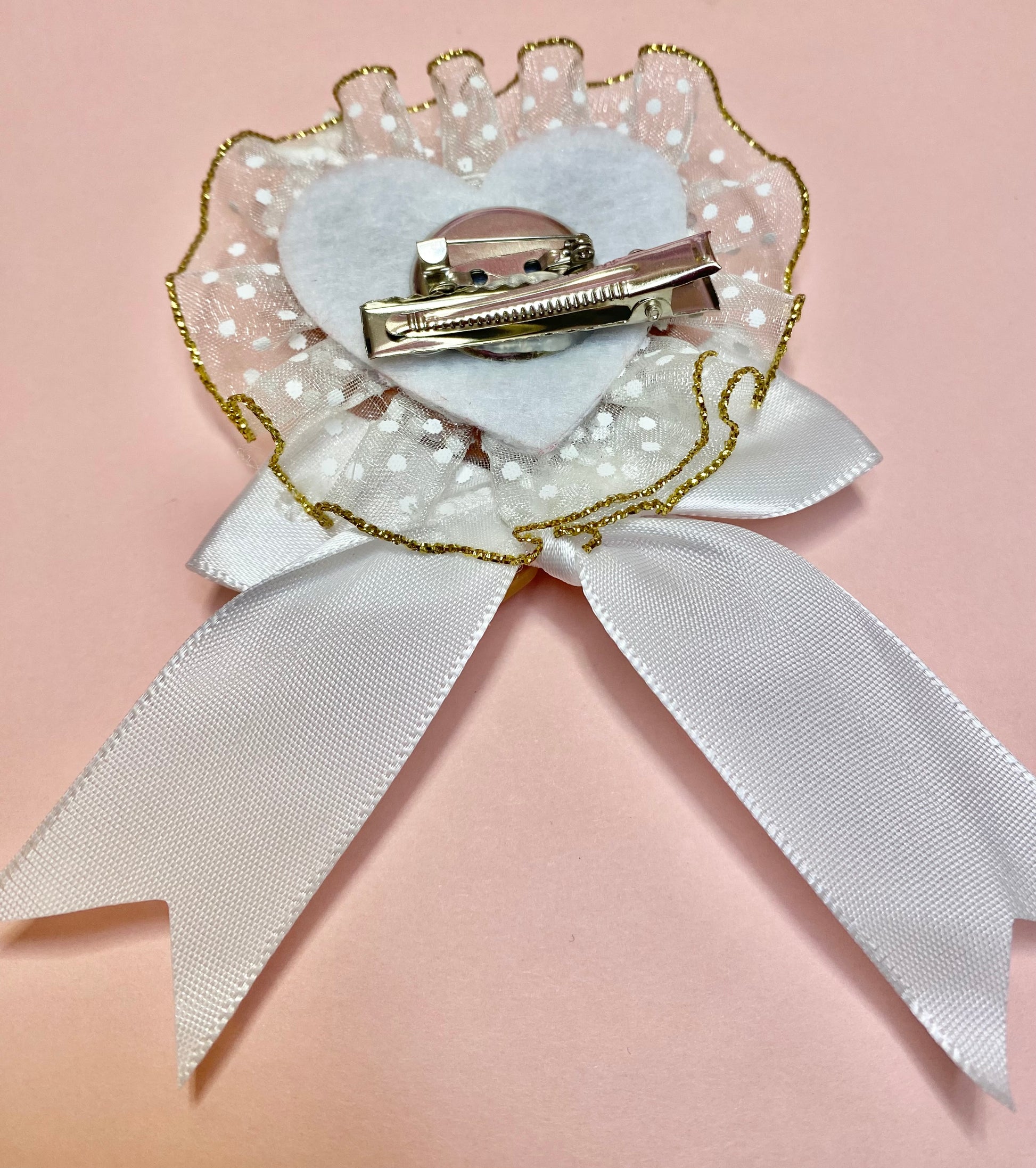 Heart Cookie 2-way Clip has a pin back and clip setting for 2 ways to wear, with soft white lace and a large white bow