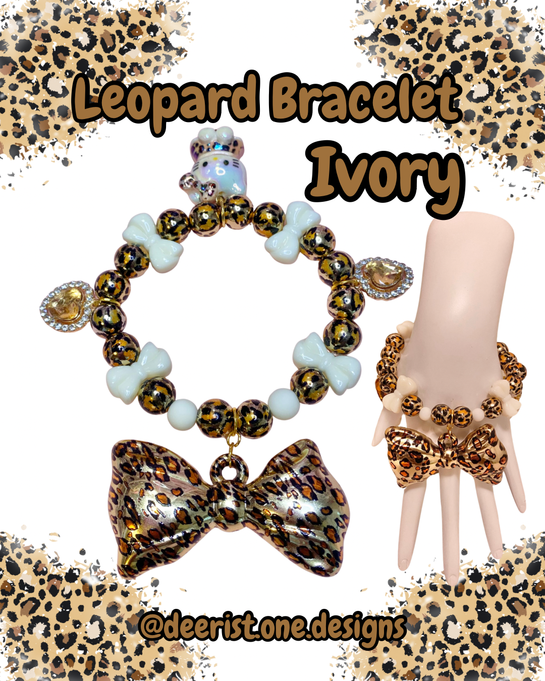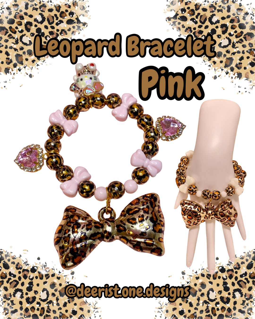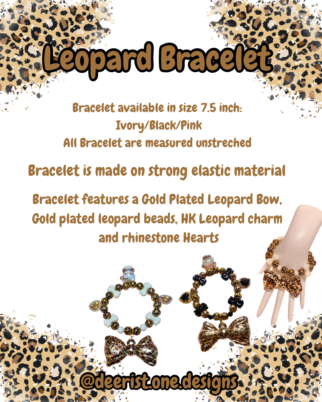 Bracelet features a Gold Plated Leopard Bow, Gold plated leopard beads, HK Leopard charm and rhinestone Hearts