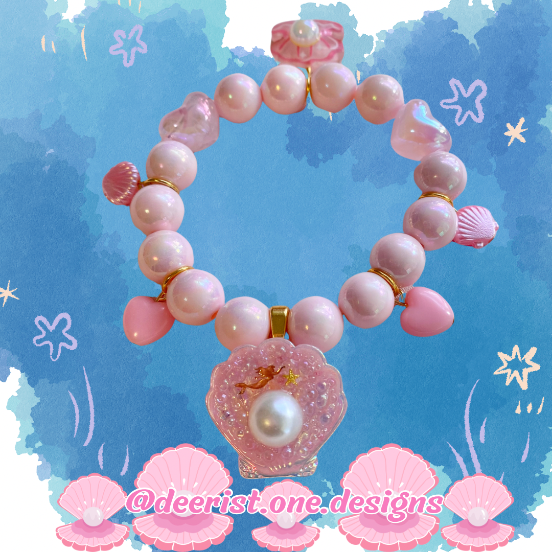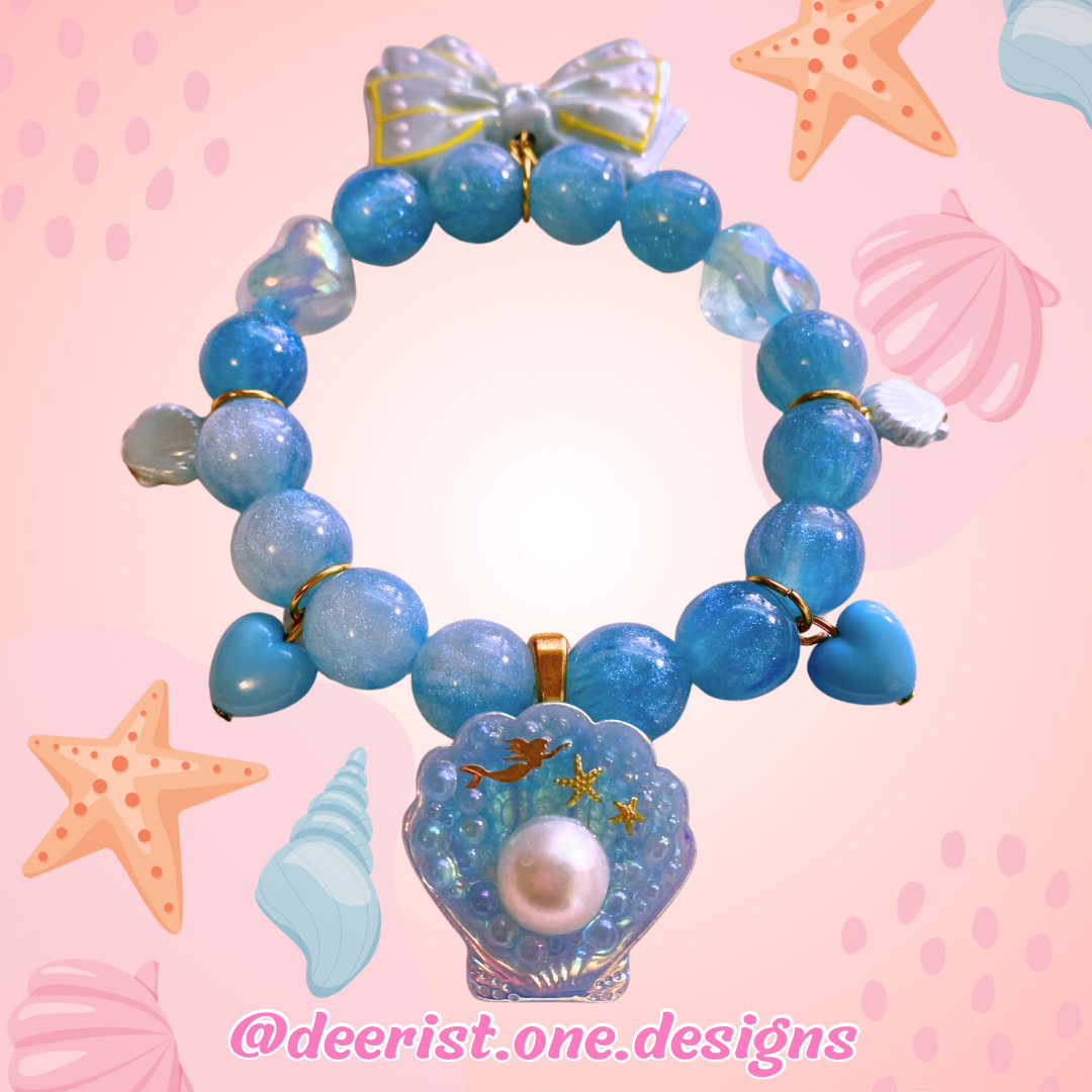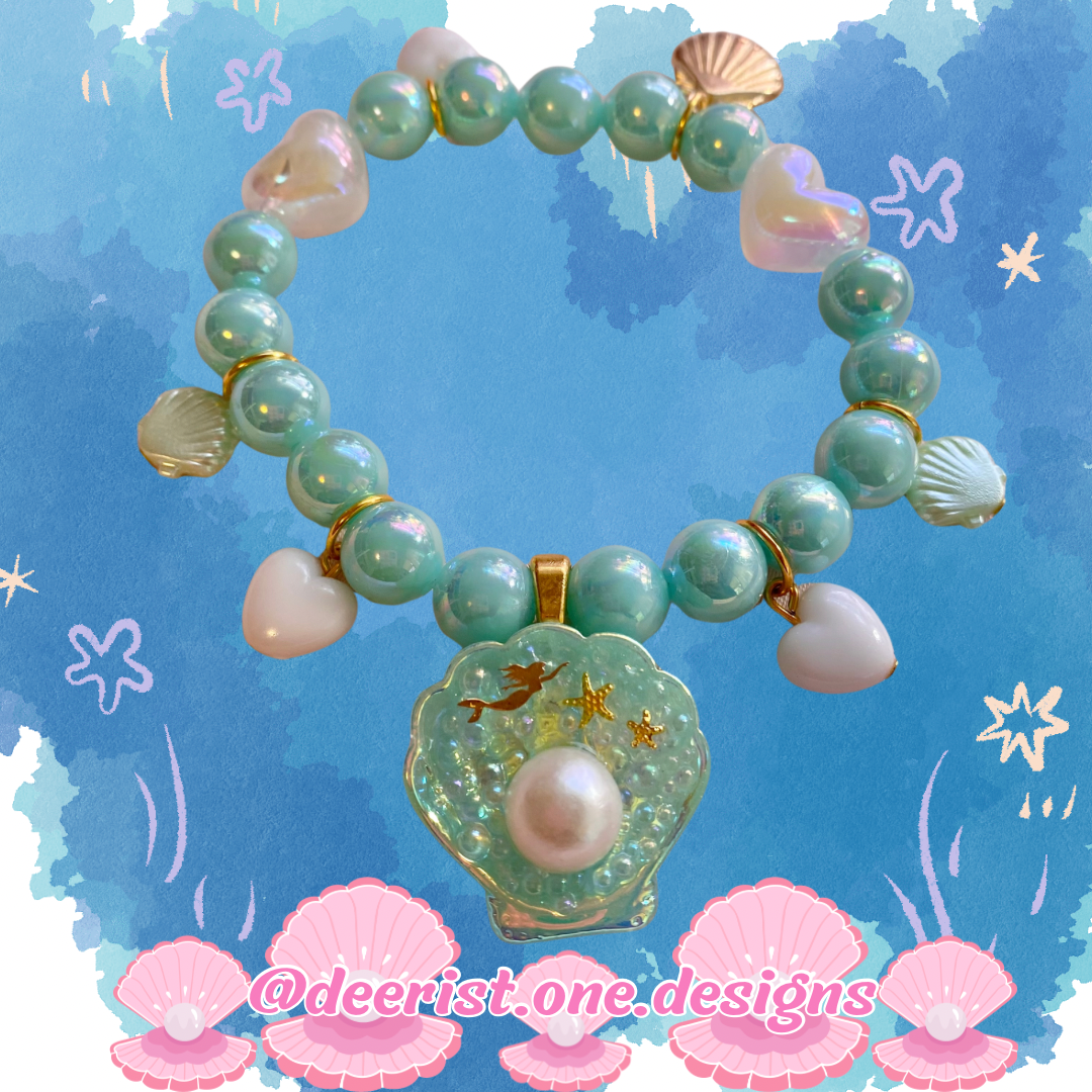 Bracelet features a hand decorated Mermaid Shell with your pick of bubbles/Pearl or Bubbles/Sea treasures/spoon/dolphin