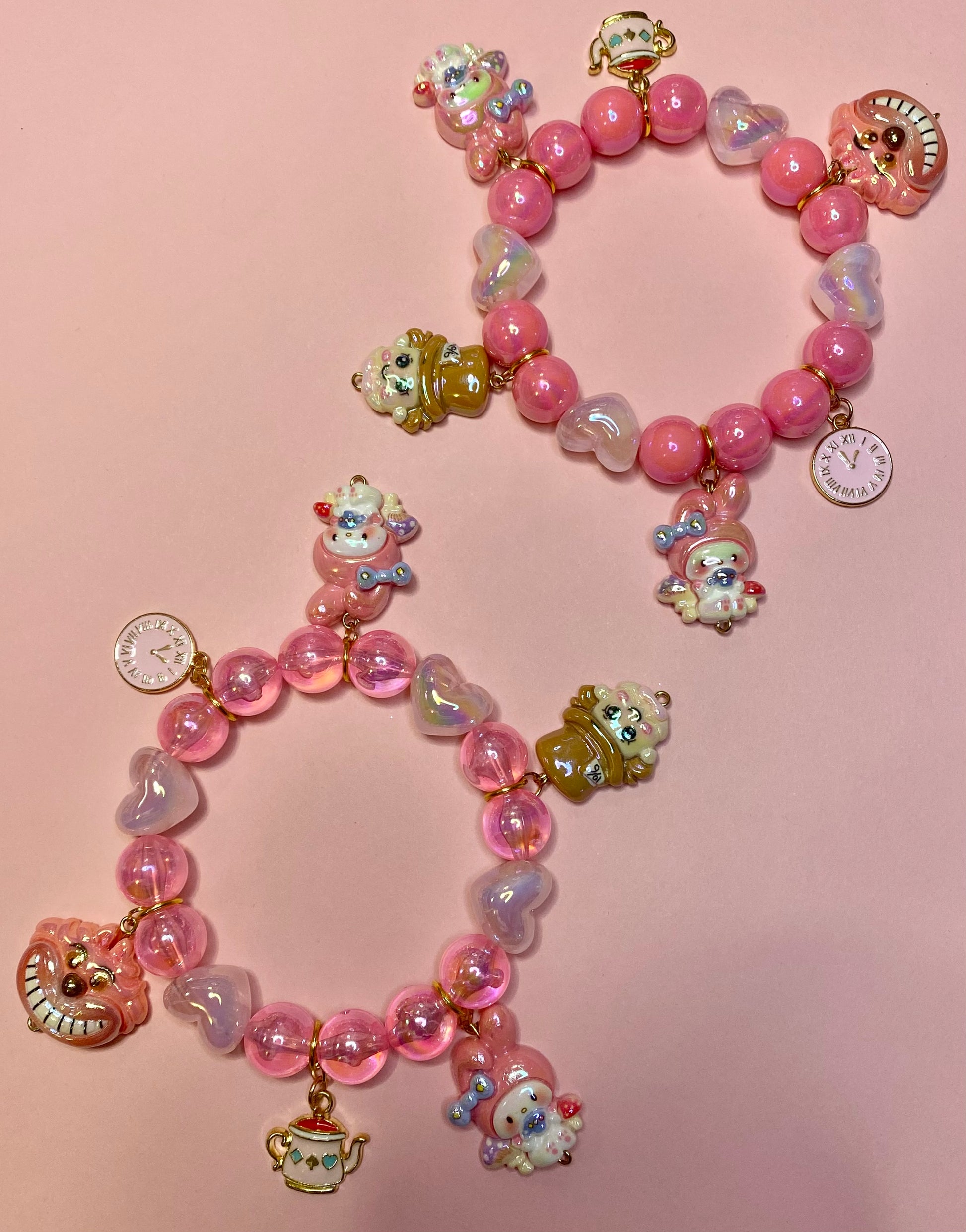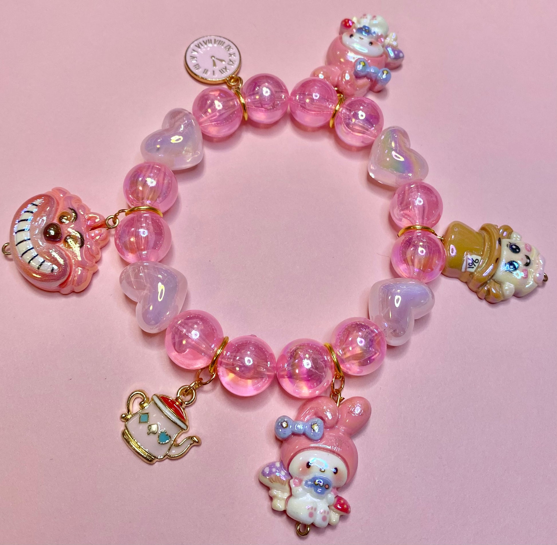 Bracelet features Pink bunny accent charms/smiling cat face/hatted friend/tea cups and clocks
