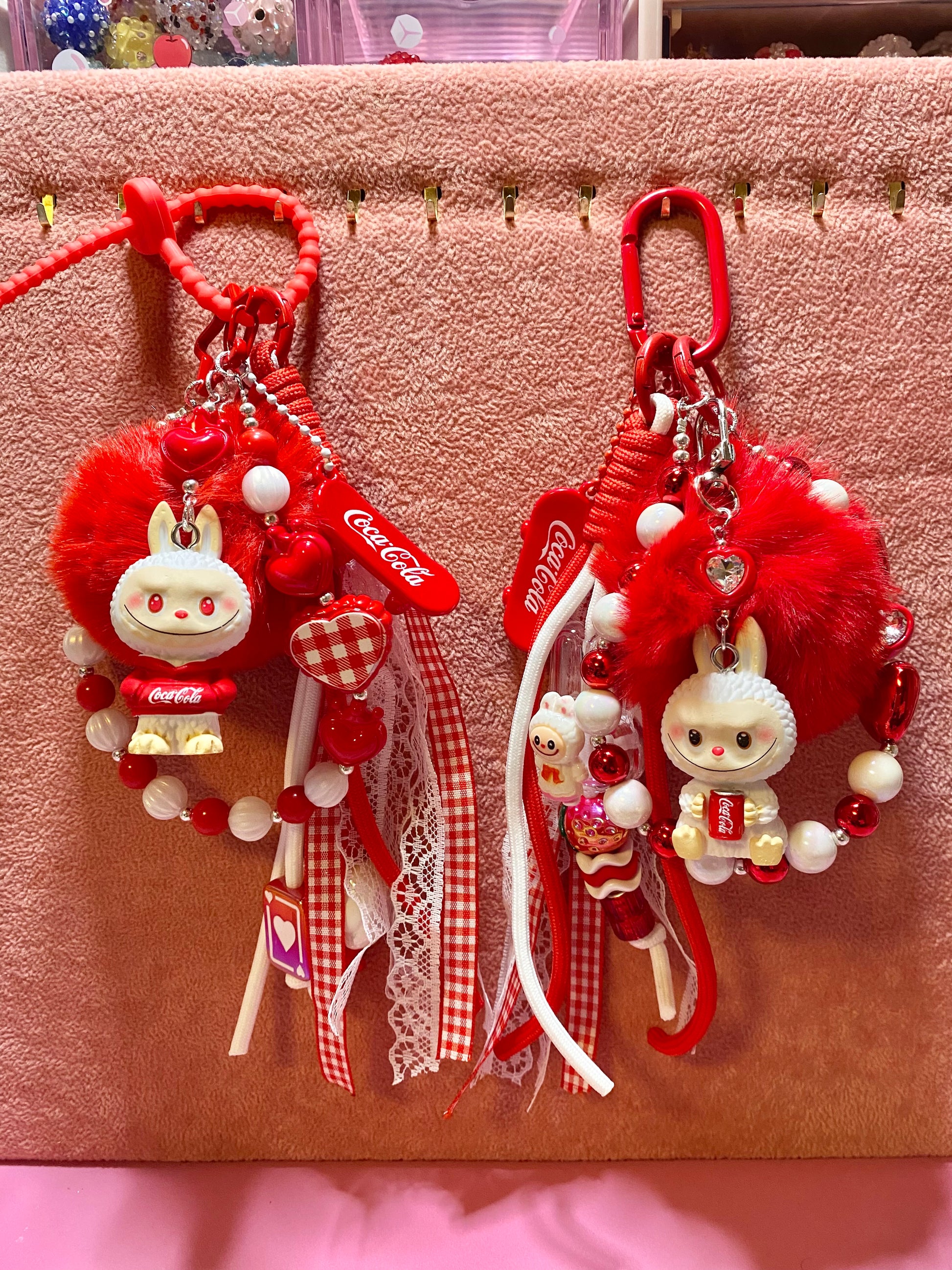 Keychain features a Cola Monster, hand arranged keychain strap, red fluffy attachment and cloth strap with various beads