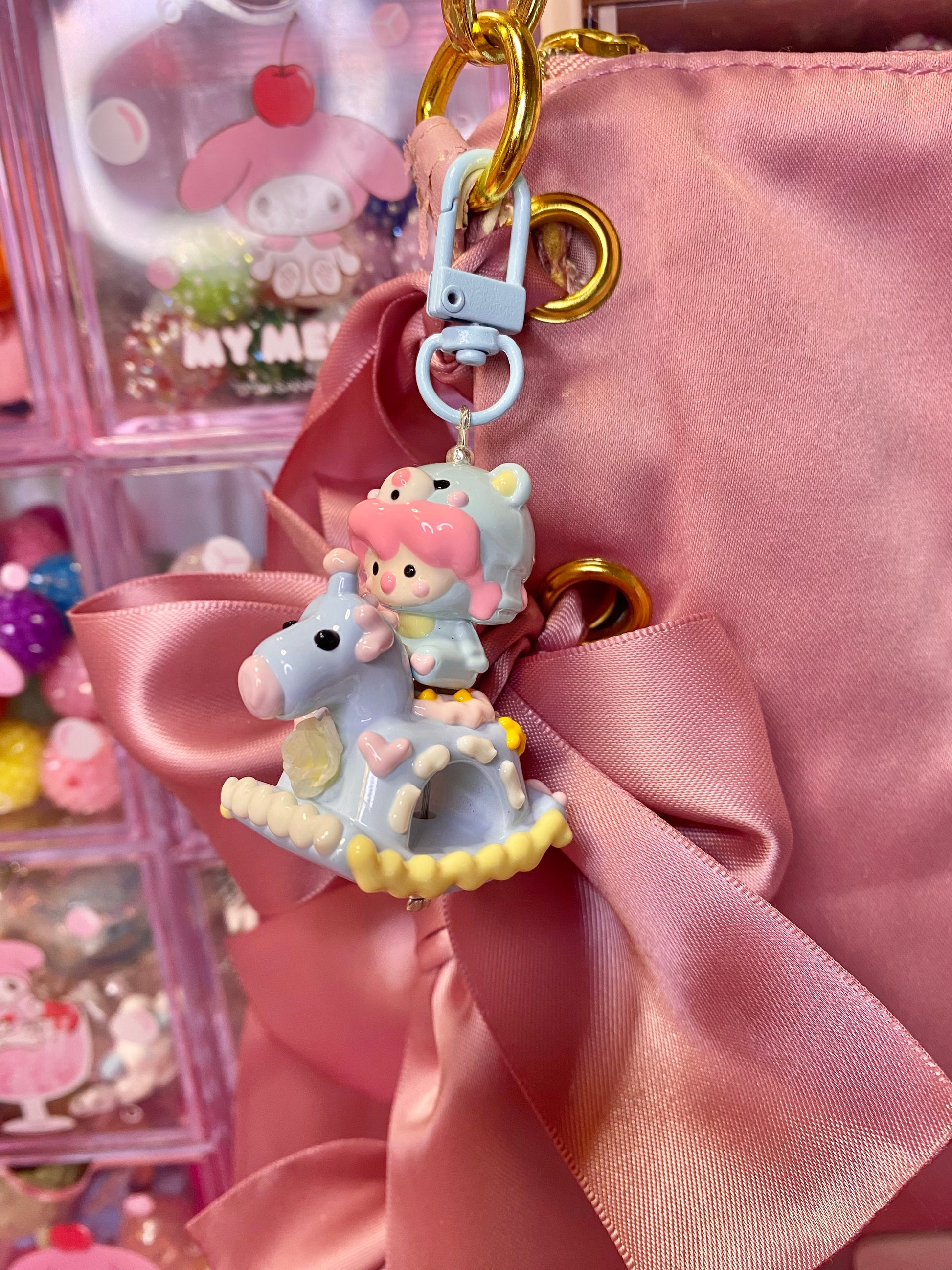 Cute little characters riding a tiny rocking horse!