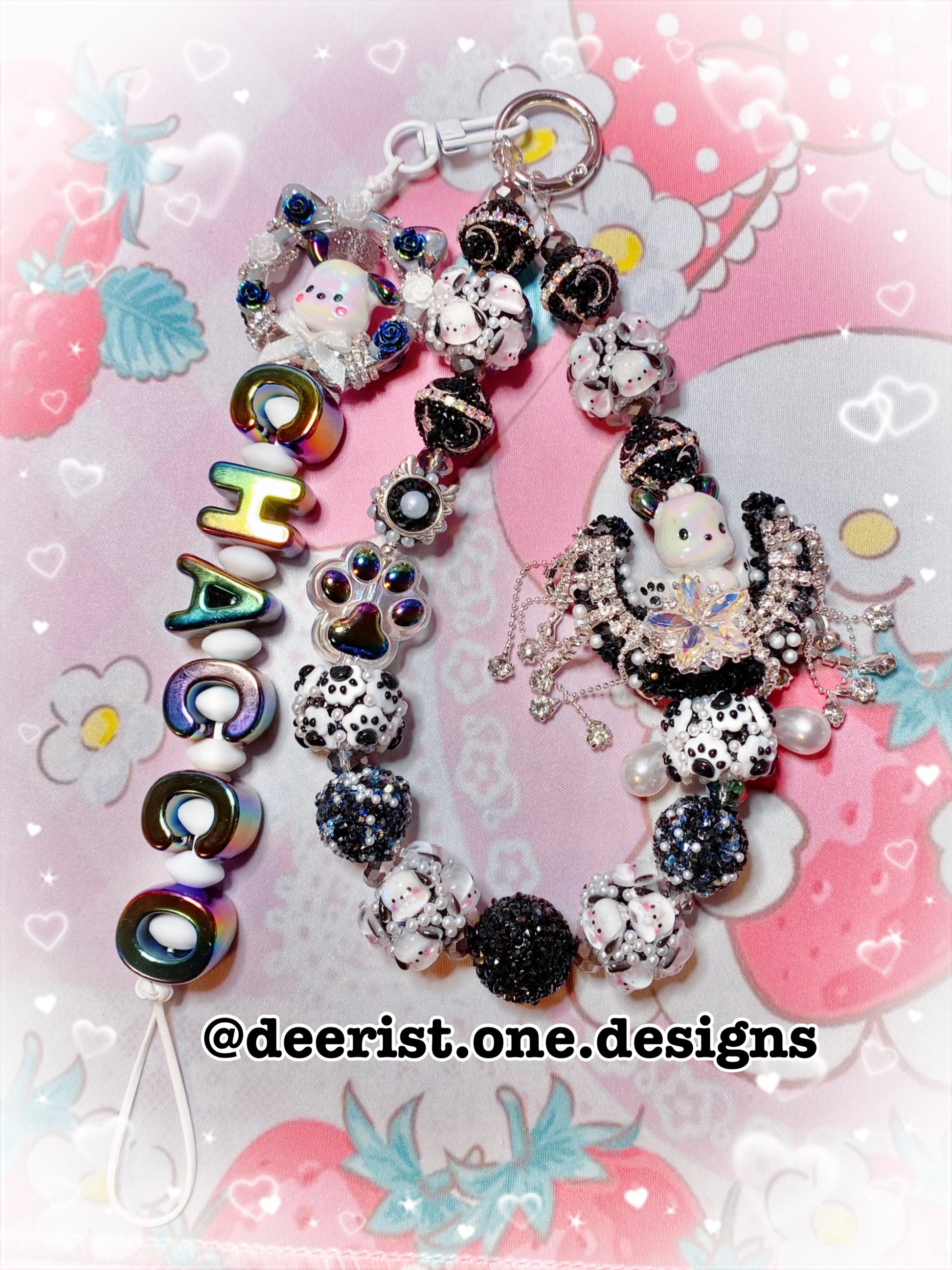 Keychain features a sweet black/white puppy, fancy moon w/spinner bit, premium fancy beads and a handmade detachable name keychain bit