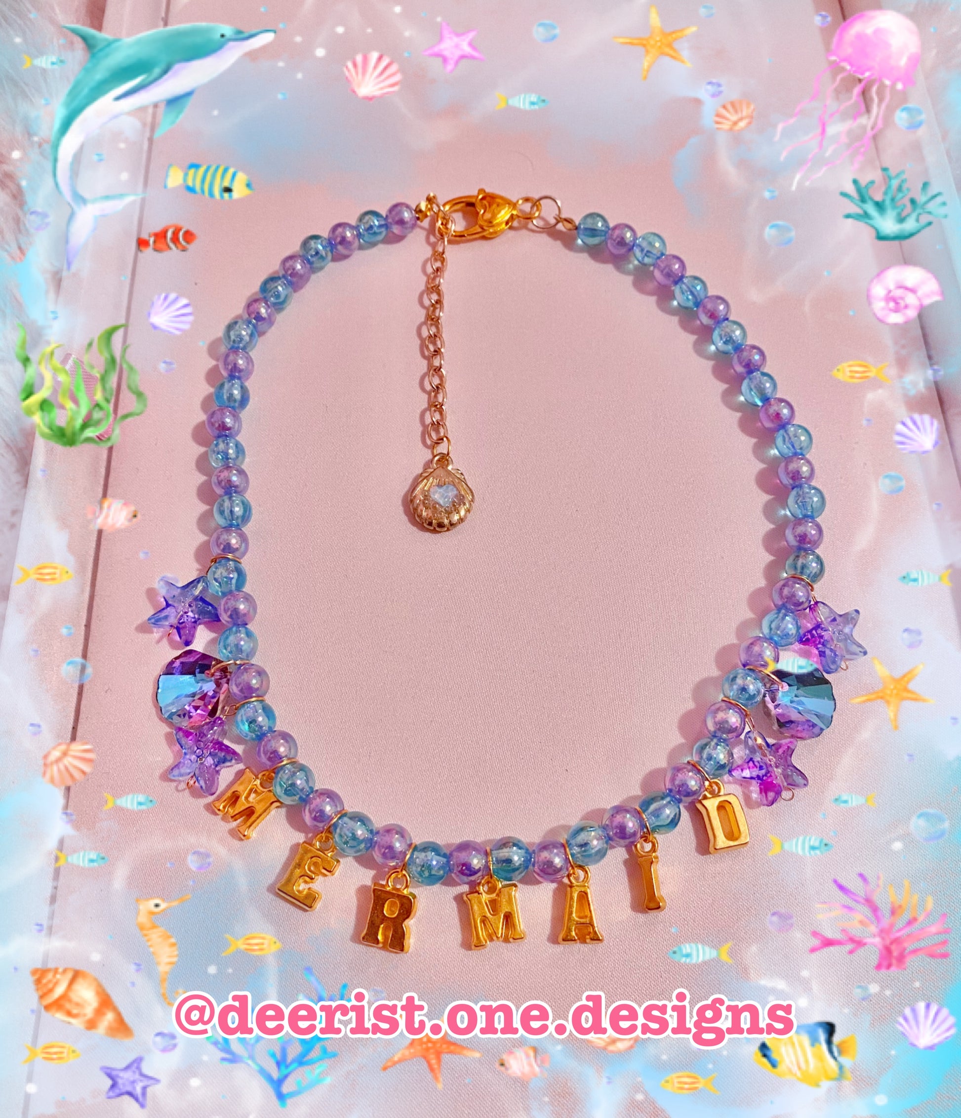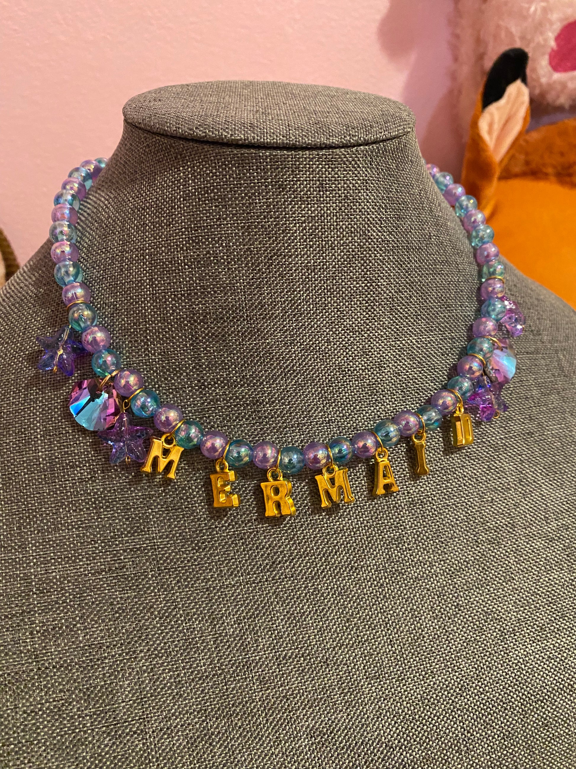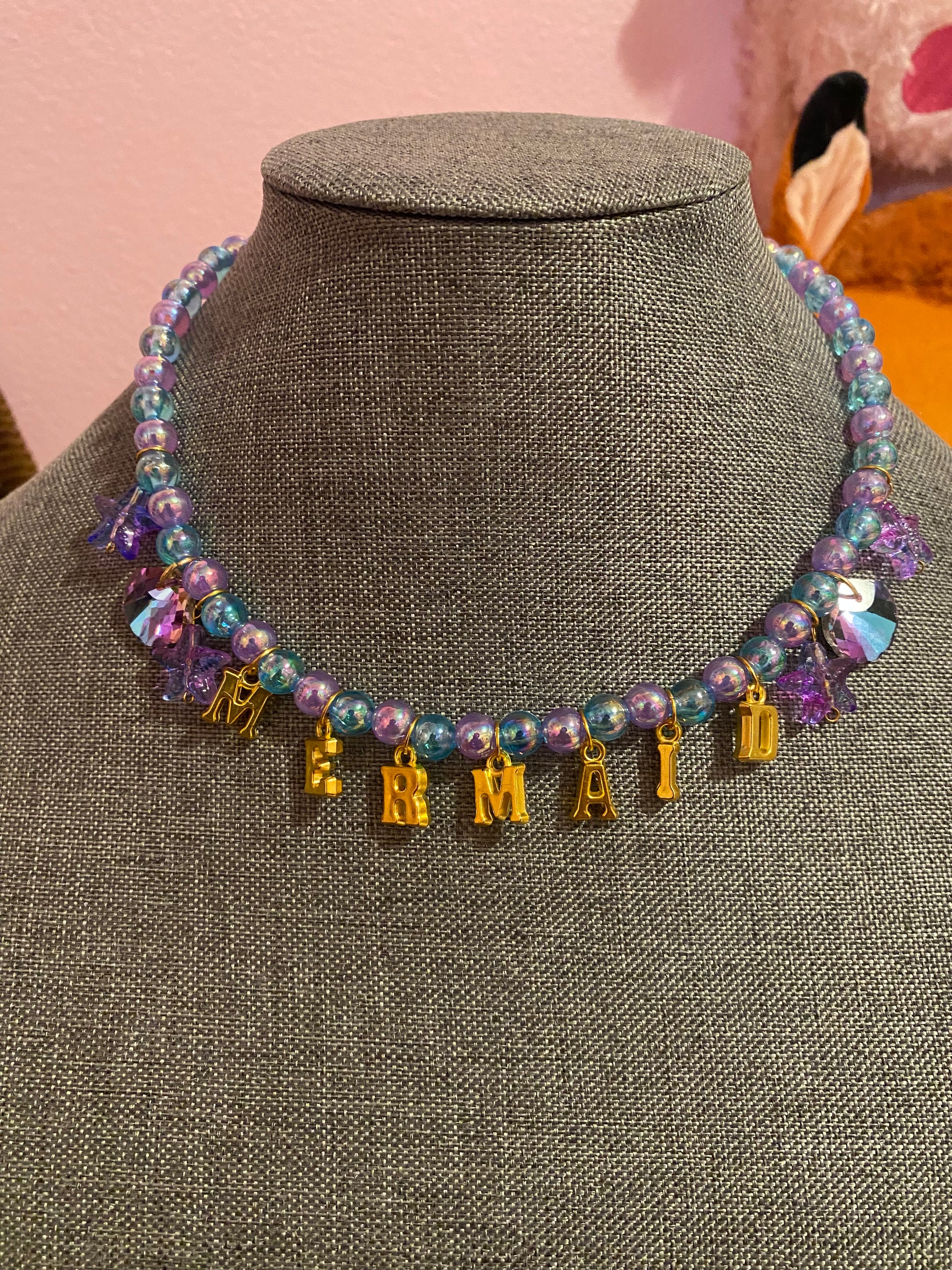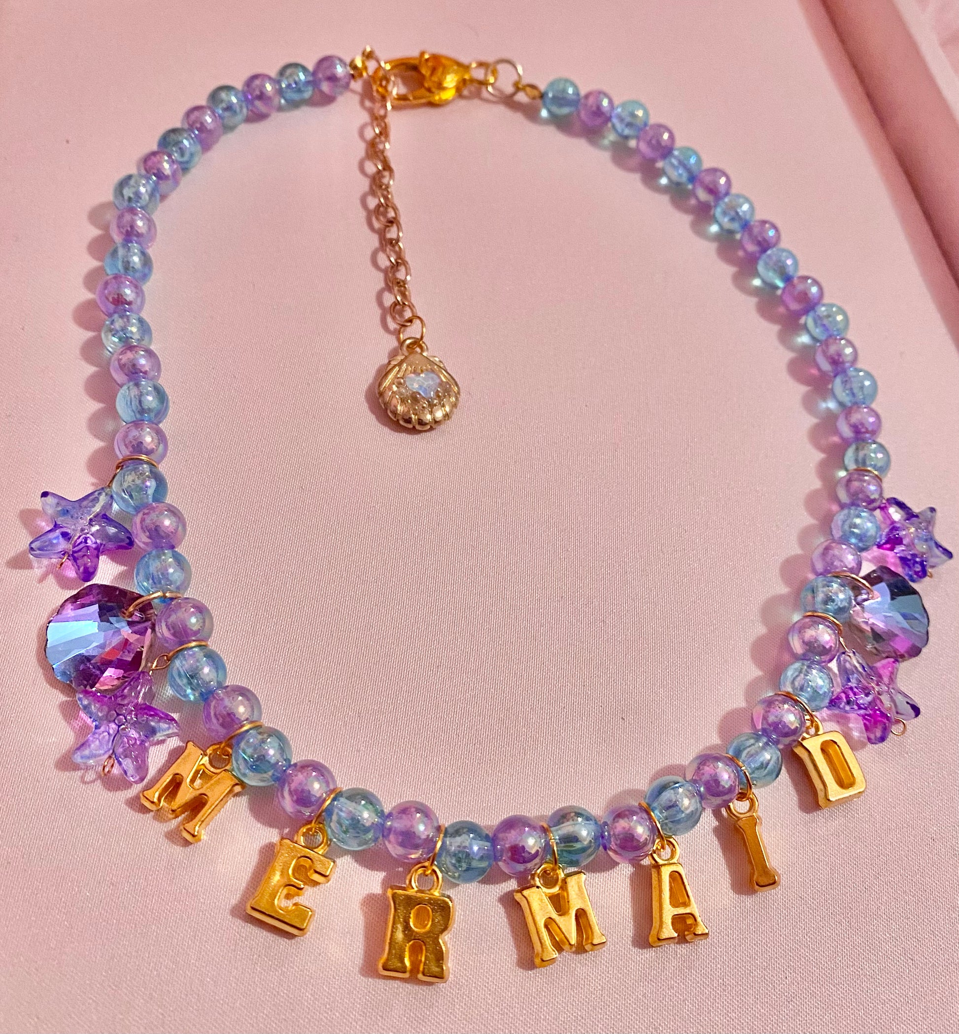 Necklace is on a hand beaded chain made of luminous purple and blue beads, seashell charms, starfish charms and golden letters spelling out โMermaidโย