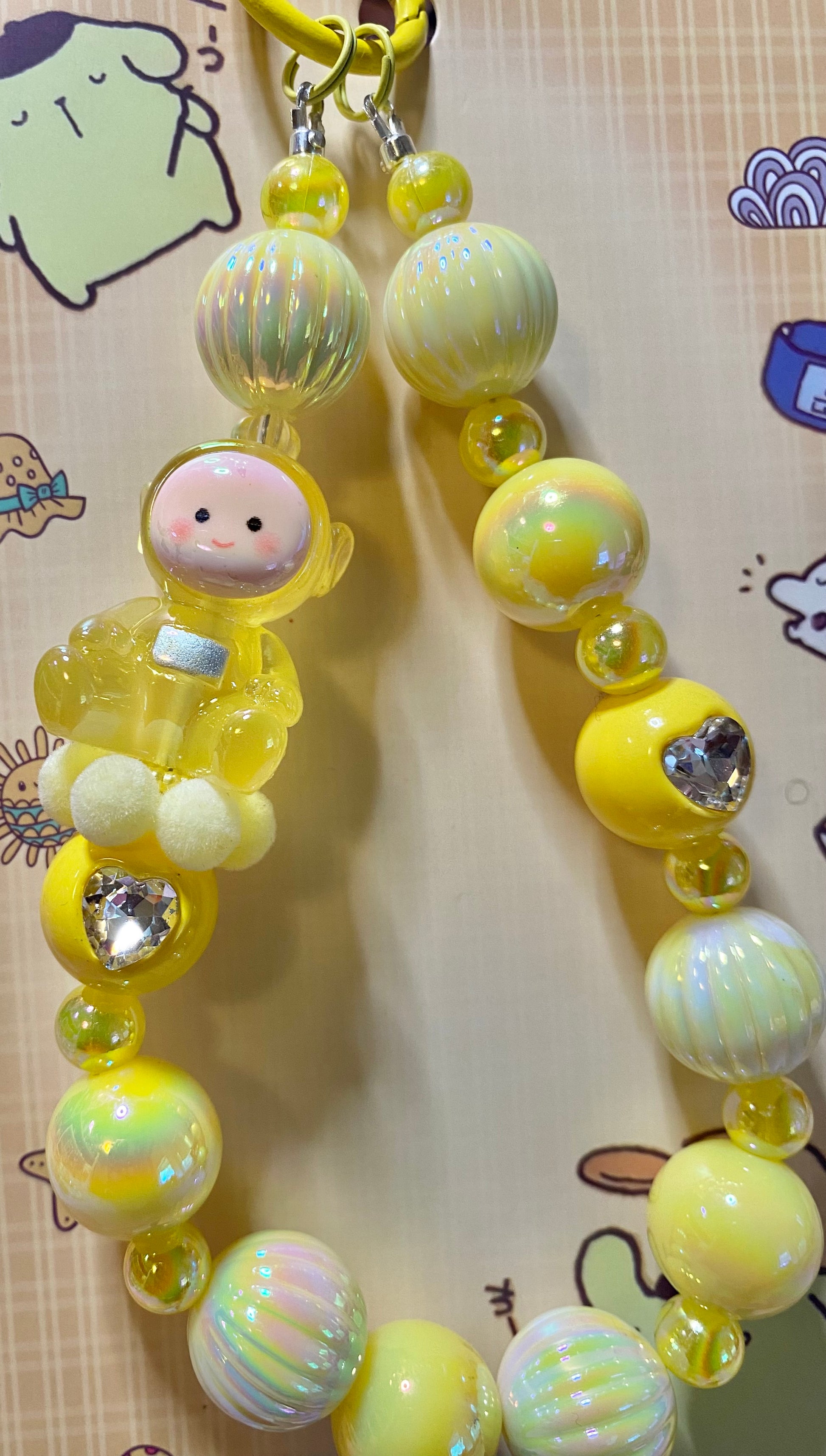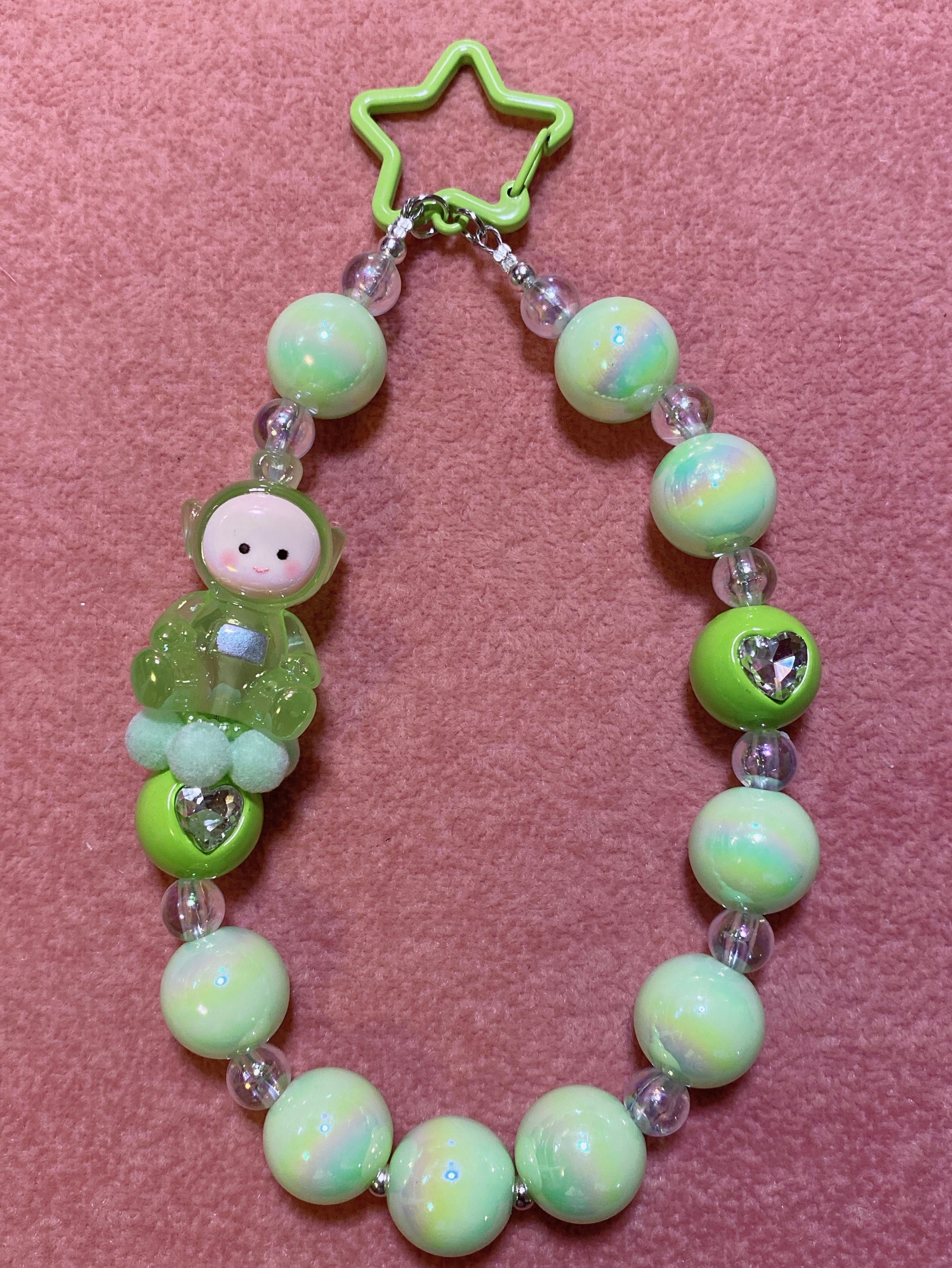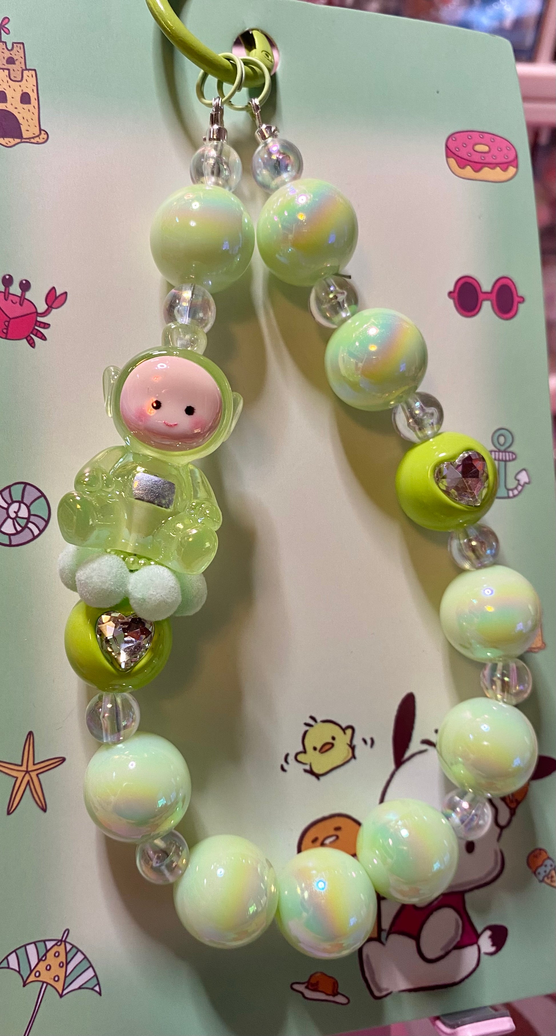 This keychain features a cute Tv Friend sitting on flocked bead on a hand arranged keychain attachment